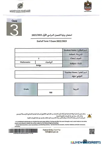 امتحان نهاية الفصل الدراسي الأول لمادة الرياضيات صف ثالث2022-2023