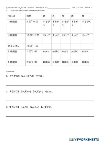 Japanese I 時間割2