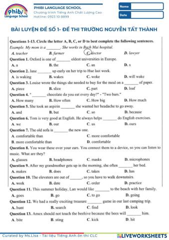 Đề thi vào lớp 6 - Trường chuyên Nguyễn Tất Thành