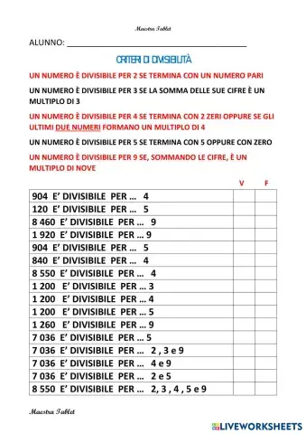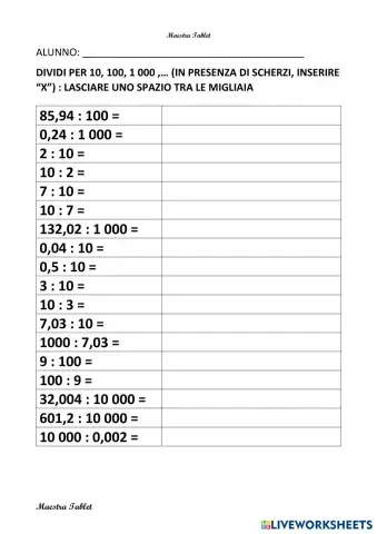 • Matematica MOLTIPLICAZIONI E DIVISIONI: INSERIMENTO VIRGOLE, ELIMINAZIONE EVENTUALI ZERI INUTILI Italian Classe quinta - Scuola Primaria