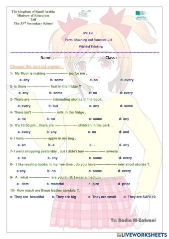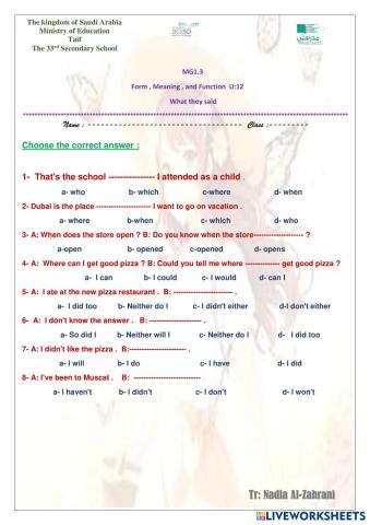 • English as a Second Language (ESL) Form meaning and Function U7 English 1st. Grade Secondary school