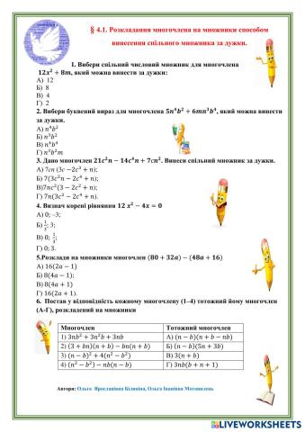 • математика Розкладання многочлена на множники способом винесення спільного множника за дужки. Ukrainian Level 7