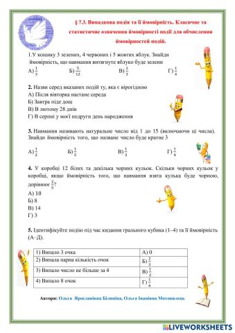 • математика Випадкова подія та її ймовірність. Класичне та статистичне означення ймовірності події Ukrainian Level 7