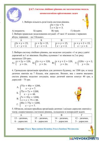 • математика Система лінійних рівнянь як математична модель компетентнісно орієнтованих задач Ukrainian Level 7