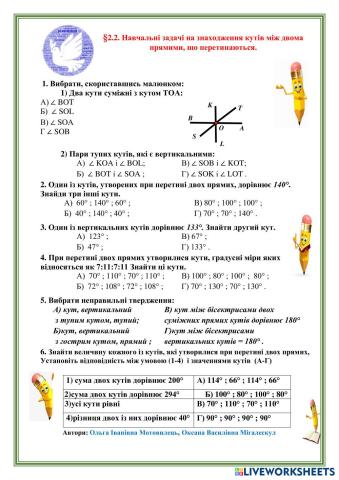 • математика Навчальні задачі на знаходження кутів між двома прямими, що перетинаються. Ukrainian Level 7