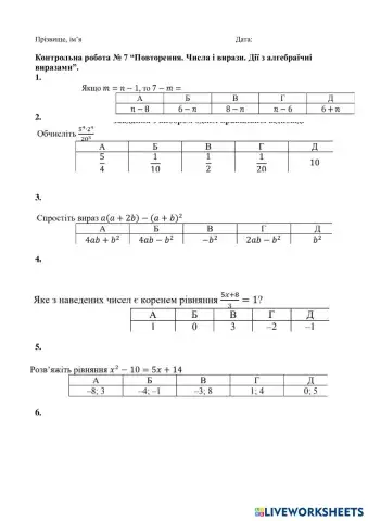 Контрольна робота. Алгебра. Повторення