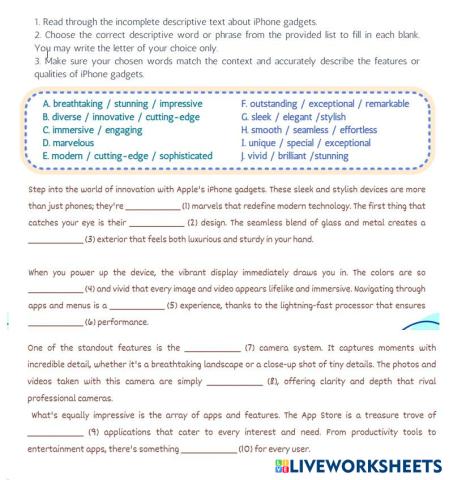 • English as a Second Language (ESL) Page 62-63 Descriptive Words fill in the gaps by Teacher Muhammed Kazim Raza English Grade 6-9