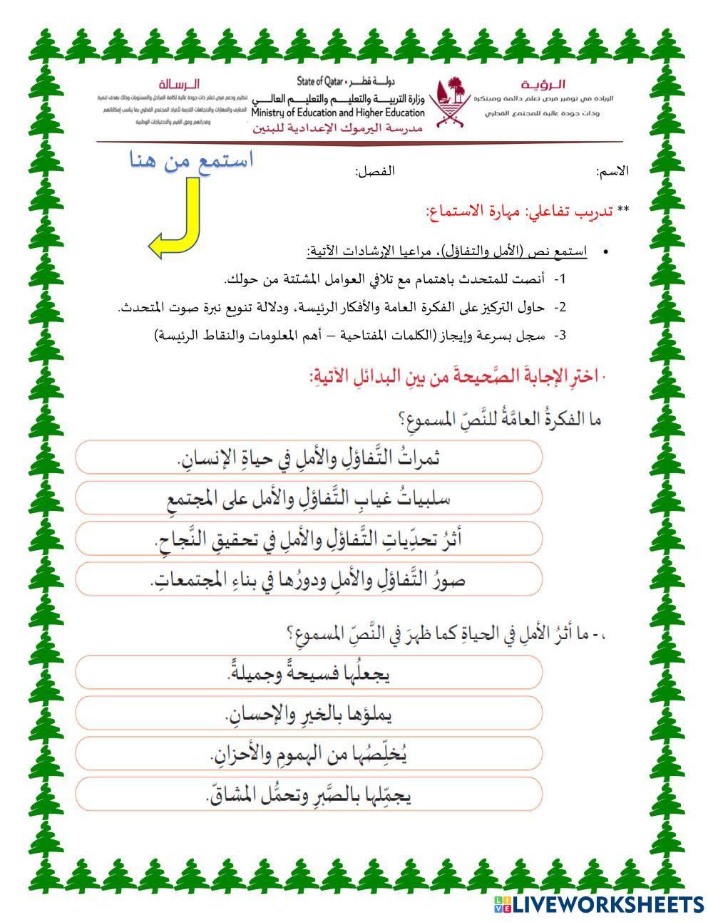 Created byرفعت مزيد اليرموك مهارة الاستماع Age 12+ level: الثامن Arabic Author's Instructions نص استماع يحقق معايير الصف الثامن My Google Classroom Courses × 0 classes selected (0 students total) Quick Access Select all classes (0 classes) All Classes Loading courses... Cancel Share Share to selected Course __COURSE_NAME__ __STUDENT_NAME__ (__STUDENT_EMAIL__) استماع التفاؤل والأمل Download Worksheet Validation Check my answers Emails my answers to my teacher Full name Group/level School subject Teacher's email or key code Close Submit Validating worksheet... (12) Your answers have been sent to your teacher. Good luck! OK We encountered an error submitting your answers. Please try again. OK Advertisement | Go Ad Free Created byرفعت مزيد اليرموك مهارة الاستماع Age 12+ level: الثامن Arabic Author's Instructions نص استماع يحقق معايير الصف الثامن