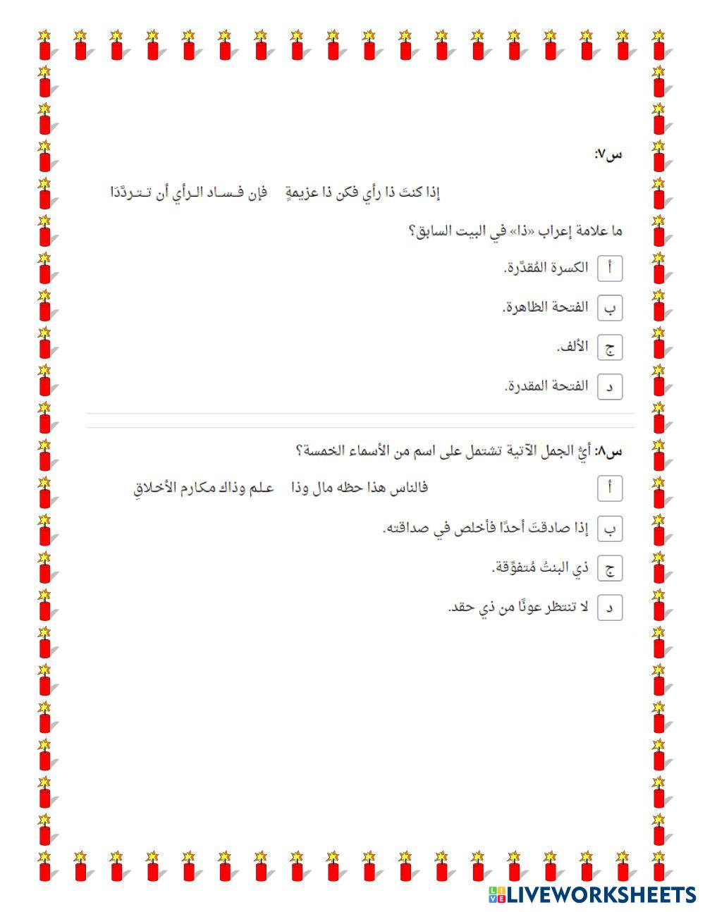 Created byرفعت مزيد Arabic language Arabic grammar Age 11-18 level: 8 Arabic Author's Instructions مراجعة الصف الثامن My Google Classroom Courses × 0 classes selected (0 students total) Quick Access Select all classes (0 classes) All Classes Loading courses... Cancel Share Share to selected Course __COURSE_NAME__ __STUDENT_NAME__ (__STUDENT_EMAIL__) الأسماء الخمسة2024 Download Worksheet Validation Check my answers Emails my answers to my teacher Full name Group/level School subject Teacher's email or key code Close Submit Validating worksheet... (12) Your answers have been sent to your teacher. Good luck! OK We encountered an error submitting your answers. Please try again. OK Advertisement | Go Ad Free Created byرفعت مزيد Arabic language Arabic grammar Age 11-18 level: 8 Arabic Author's Instructions مراجعة الصف الثامن