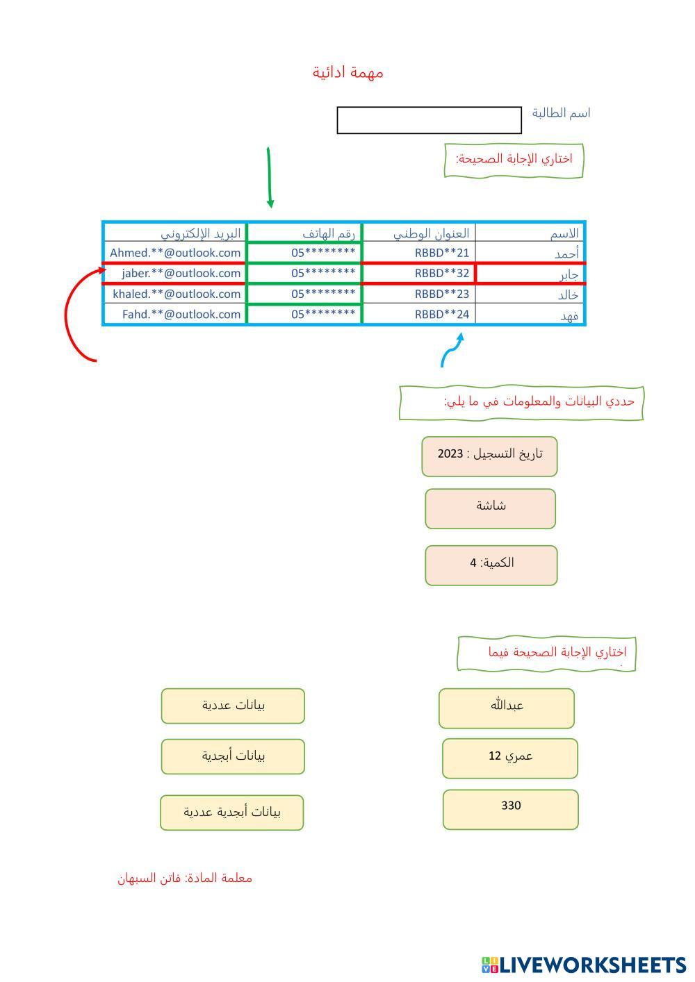 Created byfaten s computer Computer Age 12-17 level: 2 Arabic Author's Instructions My Google Classroom Courses × 0 classes selected (0 students total) Quick Access Select all classes (0 classes) All Classes Loading courses... Cancel Share Share to selected Course __COURSE_NAME__ __STUDENT_NAME__ (__STUDENT_EMAIL__) قواعد البيانات Download Worksheet Validation Check my answers Emails my answers to my teacher Full name Group/level School subject Teacher's email or key code Close Submit Validating worksheet... (12) Your answers have been sent to your teacher. Good luck! OK We encountered an error submitting your answers. Please try again. OK Advertisement | Go Ad Free Created byfaten s computer Computer Age 12-17 level: 2 Arabic Author's Instructions