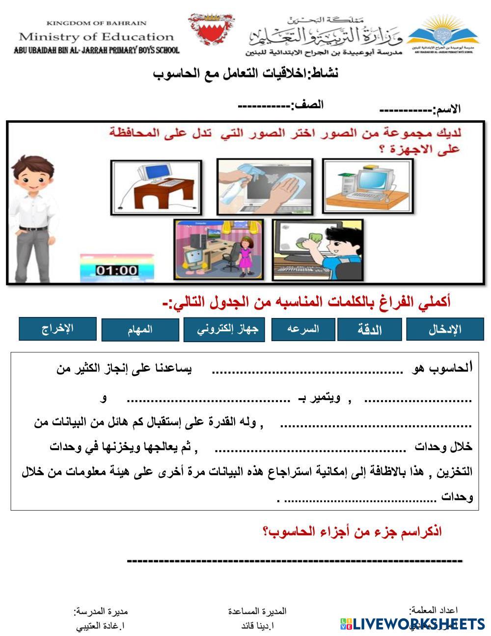 Created bymarwa magdy yaseen COMPUTER الاستخدام الصحيح والآمن للحاسوب Age 6-10 level: 1 Arabic Author's Instructions My Google Classroom Courses × 0 classes selected (0 students total) Quick Access Select all classes (0 classes) All Classes Loading courses... Cancel Share Share to selected Course __COURSE_NAME__ __STUDENT_NAME__ (__STUDENT_EMAIL__) اخلاقيات التعامل مع الحاسوب Download Worksheet Validation Check my answers Emails my answers to my teacher Full name Group/level School subject Teacher's email or key code Close Submit Validating worksheet... (12) Your answers have been sent to your teacher. Good luck! OK We encountered an error submitting your answers. Please try again. OK Advertisement | Go Ad Free Created bymarwa magdy yaseen COMPUTER الاستخدام الصحيح والآمن للحاسوب Age 6-10 level: 1 Arabic Author's Instructions