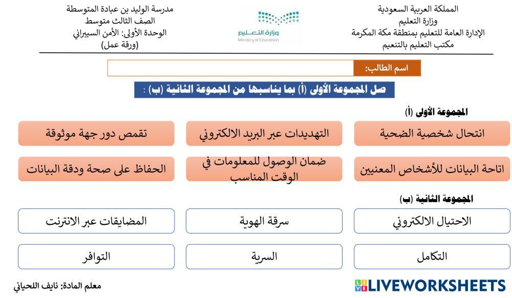 Created byNAIF AWADH ALLEHYANI Computer_Naif_3 Computer_Naif_3 Age 11-13 level: 9 Arabic Author's Instructions My Google Classroom Courses × 0 classes selected (0 students total) Quick Access Select all classes (0 classes) All Classes Loading courses... Cancel Share Share to selected Course __COURSE_NAME__ __STUDENT_NAME__ (__STUDENT_EMAIL__) الوحدة الأولى: الأمن السيبراني Download Worksheet Validation Check my answers Emails my answers to my teacher Full name Group/level School subject Teacher's email or key code Close Submit Validating worksheet... (12) Your answers have been sent to your teacher. Good luck! OK We encountered an error submitting your answers. Please try again. OK Advertisement | Go Ad Free Created byNAIF AWADH ALLEHYANI Computer_Naif_3 Computer_Naif_3 Age 11-13 level: 9 Arabic Author's Instructions