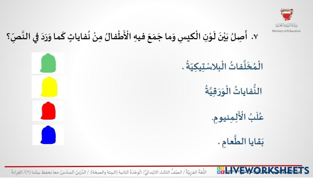 Created by saad92 ESL Arabic A1 Grammar Arabic Author's Instructions صل My Google Classroom Courses × 0 classes selected (0 students total) Quick Access Select all classes (0 classes) All Classes Loading courses... Cancel Share Share to selected Course __COURSE_NAME__ __STUDENT_NAME__ (__STUDENT_EMAIL__) معا نحفظ بيئتنا2 نشاط 1 Download Worksheet Validation Check my answers Emails my answers to my teacher Full name Group/level School subject Teacher's email or key code Close Submit Validating worksheet... (12) Your answers have been sent to your teacher. Good luck! OK We encountered an error submitting your answers. Please try again. OK Advertisement | Go Ad Free Created by saad92 ESL Arabic A1 Grammar Arabic Author's Instructions صل Explore Worksheets تركيب ESL A1 تركيب Grammar - ESL تركيب الحروف والمقاطع المرادفات والأضداد ESL A1 المرادفات والأضداد Grammar - ESL عزيزي الطالب قم بتوصيل الكلمة لمرادفها أو ضدها. المرادفات والأضداد ESL A1 المرادفات والأضداد Grammar - ESL عزيزي الطالب قم بتوصيل كل كلمة بمرادفها ترتيب أعمال الوضوء ESL A1 ترتيب أعمال الوضوء Grammar - ESL قم بالحل