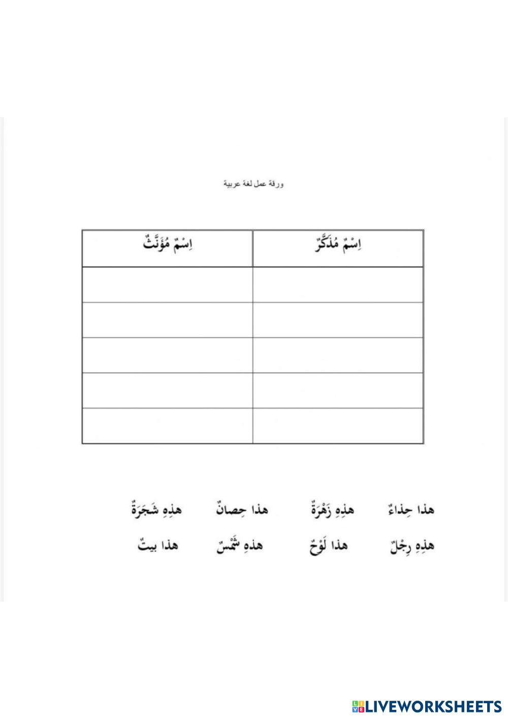 صنفوا الكلمات إلى مذكر ومؤنث في الجدول التالي