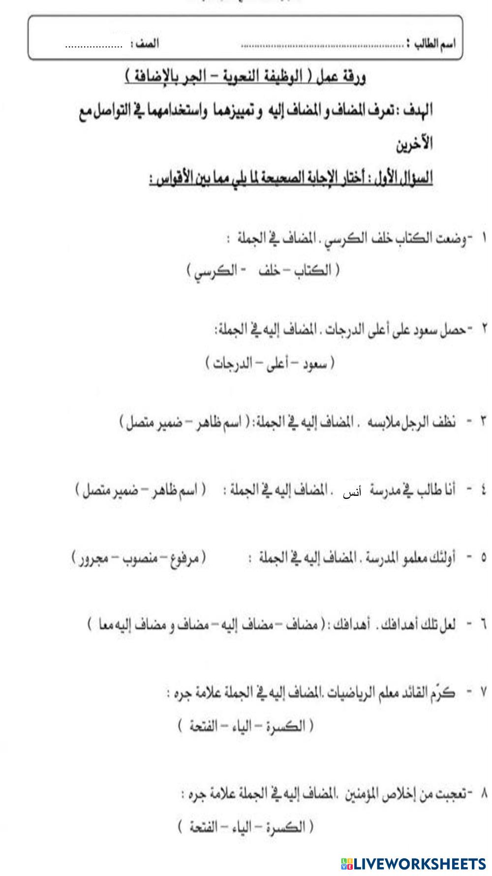 Created by za2 ESL Arabic B2 Grammar Arabic Author's Instructions اختار الإجابة الصحيحة لما يلي مما بين الأقواس: My Google Classroom Courses × 0 classes selected (0 students total) Quick Access Select all classes (0 classes) All Classes Loading courses... Cancel Share Share to selected Course __COURSE_NAME__ __STUDENT_NAME__ (__STUDENT_EMAIL__) ورقة عمل (الوظيفة النحوية - الجر بالإضافة ) Download Worksheet Validation Check my answers Emails my answers to my teacher Full name Group/level School subject Teacher's email or key code Close Submit Validating worksheet... (12) Your answers have been sent to your teacher. Good luck! OK We encountered an error submitting your answers. Please try again. OK Advertisement | Go Ad Free Created by za2 ESL Arabic B2 Grammar Arabic Author's Instructions اختار الإجابة الصحيحة لما يلي مما بين الأقواس: Explore Worksheets نشاط تفاعلي 2 /درس المفعول له /للصف الثاني عشر ESL B2 نشاط تفاعلي 2 /درس المفعول له /للصف الثاني عشر Grammar - ESL أجب عن هذا النشاط اسم الآلة ESL B2 اسم الآلة Grammar - ESL أجيبي عن النشاط التالي المجرد والمزيد ESL B2 المجرد والمزيد Grammar - ESL المجرد والمزيد اليوم العالمي1.3 ESL B2 اليوم العالمي1.3 Grammar - ESL Drag the verbs and adjectives to their correct places in the table.