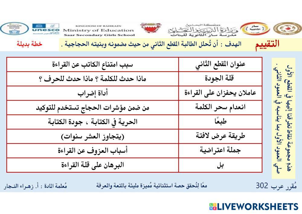 Created by teacher_zahraa99 ESL Arabic C2 Reading Arabic Author's Instructions هذهِ نقاط تمت مناقشتها أثناء عملية التحليل وفهم مضمون المقطع عندما تعرفين مايربطها فأنتِ لديكِ النقاط الأساسية التي ستسهل عليكِ عملية المراجعة لاحقًا My Google Classroom Courses × 0 classes selected (0 students total) Quick Access Select all classes (0 classes) All Classes Loading courses... Cancel Share Share to selected Course __COURSE_NAME__ __STUDENT_NAME__ (__STUDENT_EMAIL__) تقييم المقطع الثاني درس جودة الأدب ومصير المطالعة Download Worksheet Validation Check my answers Emails my answers to my teacher Full name Group/level School subject Teacher's email or key code Close Submit Validating worksheet... (12) Your answers have been sent to your teacher. Good luck! OK We encountered an error submitting your answers. Please try again. OK Advertisement | Go Ad Free Created by teacher_zahraa99 ESL Arabic C2 Reading Arabic Author's Instructions هذهِ نقاط تمت مناقشتها أثناء عملية التحليل وفهم مضمون المقطع عندما تعرفين مايربطها فأنتِ لديكِ النقاط الأساسية التي ستسهل عليكِ عملية المراجعة لاحقًا Explore Worksheets المقطع الأول جودة الأدب ومصير المطالعة ESL C2 المقطع الأول جودة الأدب ومصير المطالعة Reading - ESL النشاط يُذكركِ بالنقاط الأساسية التي تمت مناقشتها خلال تحليل المقطع الأول تقييم الهدف الأول / المقطع الثالث ESL C2 تقييم الهدف الأول / المقطع الثالث Reading - ESL اختاري مايتناسب مع العمود الأول في العمود الثاني الصوم ب ESL C2 الصوم ب Reading - ESL شروط الصوم الصوم أ ESL C2 الصوم أ Reading - ESL شروط الصوم