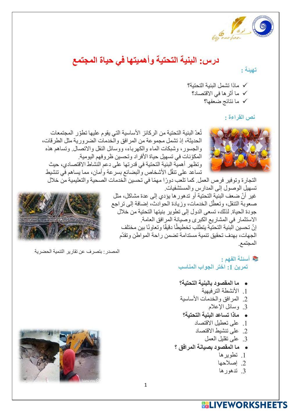 Created by nourhen daaboub ESL Arabic B1 Reading Arabic Author's Instructions إقرأ النص جيدا ثم أجب عن أسئلته وتحصل على علامة من 10 My Google Classroom Courses × 0 classes selected (0 students total) Quick Access Select all classes (0 classes) All Classes Loading courses... Cancel Share Share to selected Course __COURSE_NAME__ __STUDENT_NAME__ (__STUDENT_EMAIL__) درس البنية التحتية Download Worksheet Validation Check my answers Emails my answers to my teacher Full name Group/level School subject Teacher's email or key code Close Submit Validating worksheet... (12) Your answers have been sent to your teacher. Good luck! OK We encountered an error submitting your answers. Please try again. OK Advertisement | Go Ad Free Created by nourhen daaboub ESL Arabic B1 Reading Arabic Author's Instructions إقرأ النص جيدا ثم أجب عن أسئلته وتحصل على علامة من 10 Explore Worksheets درس حوادث المرور ESL B1 درس حوادث المرور Reading - ESL أجب على تمارين درس الحوادث أنواع النصوص - التنسيق ESL B1 أنواع النصوص - التنسيق Reading - ESL اختيار من متعدد كيف قضيت إجازتي ؟ ESL B1 كيف قضيت إجازتي ؟ Reading - ESL اقرأ ثم أجب كيف قضيت إجازتي ؟ ESL B1 كيف قضيت إجازتي ؟ Reading - ESL اقرأ ثم أجب
