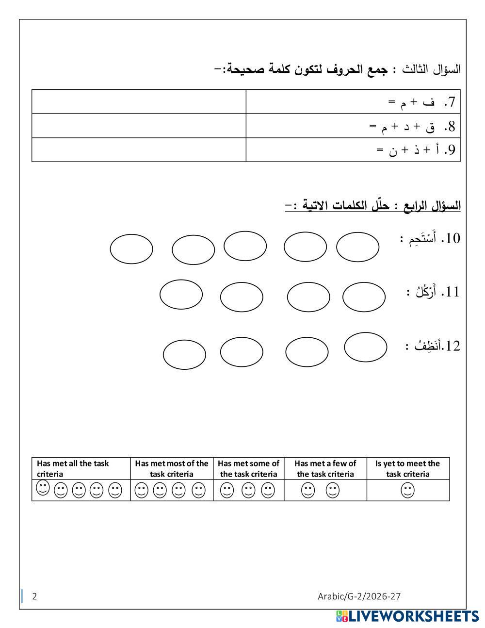 Created by nusrathmuhammad ESL Arabic A1 Vocabulary Arabic Author's Instructions READ THE WORDS My Google Classroom Courses × 0 classes selected (0 students total) Quick Access Select all classes (0 classes) All Classes Loading courses... Cancel Share Share to selected Course __COURSE_NAME__ __STUDENT_NAME__ (__STUDENT_EMAIL__) أجزاء الجسم Download Worksheet Validation Check my answers Emails my answers to my teacher Full name Group/level School subject Teacher's email or key code Close Submit Validating worksheet... (12) Your answers have been sent to your teacher. Good luck! OK We encountered an error submitting your answers. Please try again. OK Advertisement | Go Ad Free Created by nusrathmuhammad ESL Arabic A1 Vocabulary Arabic Author's Instructions READ THE WORDS Explore Worksheets Lec1 ESL A1 Lec1 Vocabulary - ESL التركيز علي المفاهيم ورقة عمل الوضوء ESL A1 ورقة عمل الوضوء Vocabulary - ESL قم بالحل حرف الزاي ESL A1 حرف الزاي Vocabulary - ESL ابحث عن الكلمات التي تبدا بحرف الزاي ورقة عمل للصف الأول(الوحدة السادسة) الدرس الثاني والبلاغة ESL A1 ورقة عمل للصف الأول(الوحدة السادسة) الدرس الثاني والبلاغة Vocabulary - ESL ورقة عمل تفاعلية