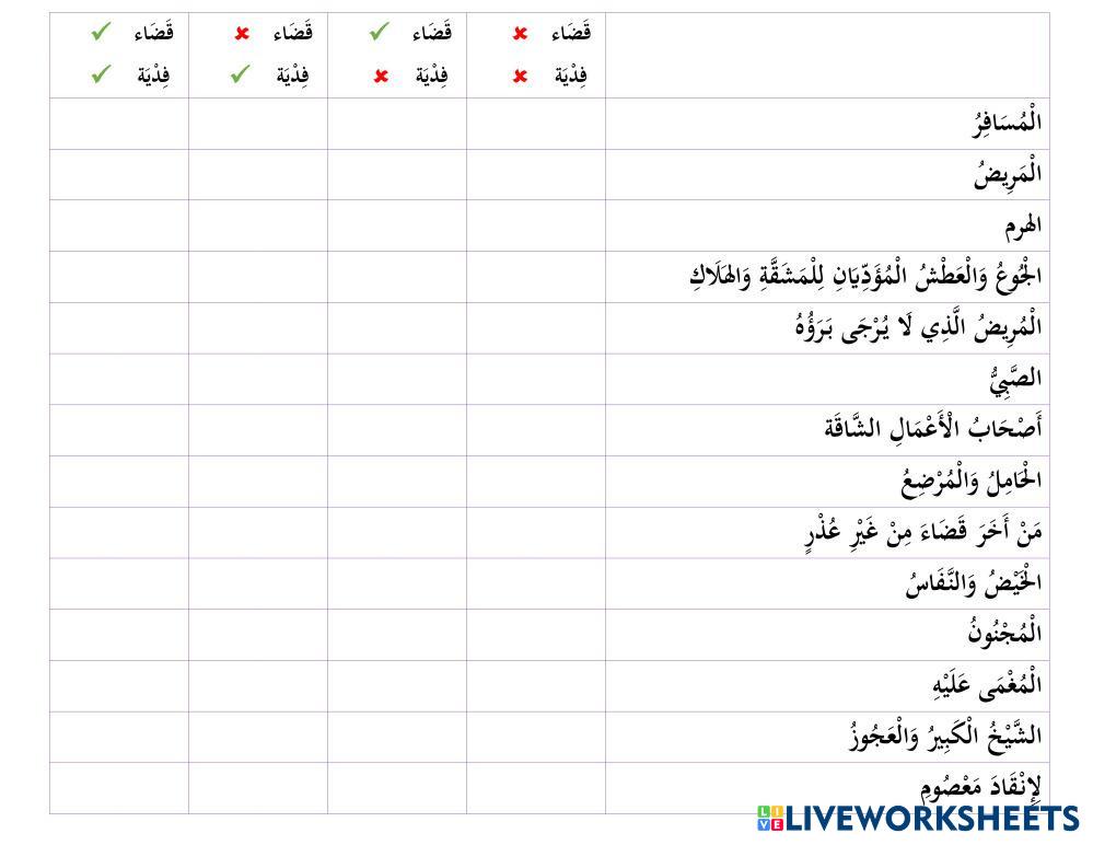Created byJune Arifin Fiqeh Saum Age 12-15 level: 6 Arabic Author's Instructions My Google Classroom Courses × 0 classes selected (0 students total) Quick Access Select all classes (0 classes) All Classes Loading courses... Cancel Share Share to selected Course __COURSE_NAME__ __STUDENT_NAME__ (__STUDENT_EMAIL__) جَوَازُ الْفِطْرِ وَوُجُوبُ الْقَضَاءِ Download Worksheet Validation Check my answers Emails my answers to my teacher Full name Group/level School subject Teacher's email or key code Close Submit Validating worksheet... (12) Your answers have been sent to your teacher. Good luck! OK We encountered an error submitting your answers. Please try again. OK Advertisement | Go Ad Free Created byJune Arifin Fiqeh Saum Age 12-15 level: 6 Arabic Author's Instructions