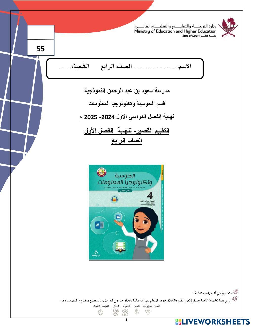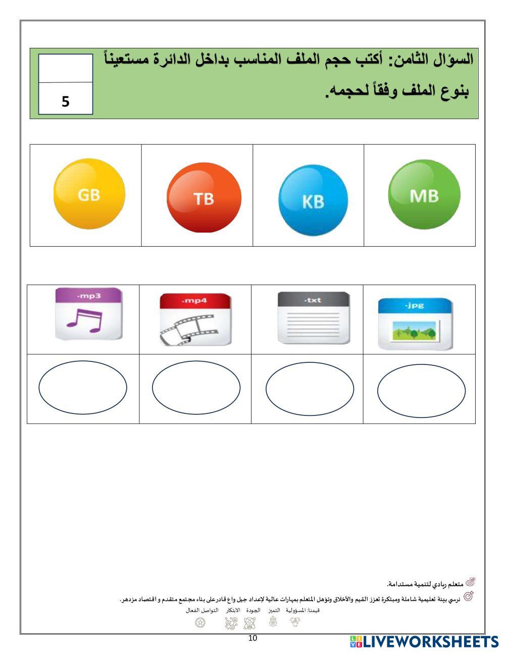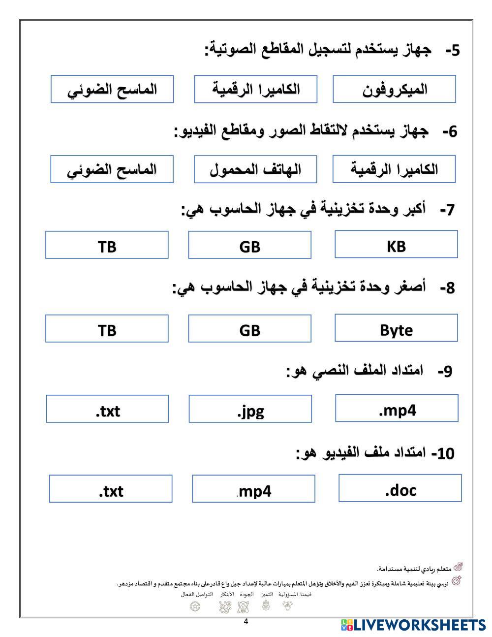 Created bymarwa adel ict Ict Age 9-14 level: 4 Arabic Author's Instructions My Google Classroom Courses × 0 classes selected (0 students total) Quick Access Select all classes (0 classes) All Classes Loading courses... Cancel Share Share to selected Course __COURSE_NAME__ __STUDENT_NAME__ (__STUDENT_EMAIL__) تقييم قصير للصف الرابع الابتدائي نهاية الفصل الدراسي الاول Download Worksheet Validation Check my answers Emails my answers to my teacher Full name Group/level School subject Teacher's email or key code Close Submit Validating worksheet... (12) Your answers have been sent to your teacher. Good luck! OK We encountered an error submitting your answers. Please try again. OK Advertisement | Go Ad Free Created bymarwa adel ict Ict Age 9-14 level: 4 Arabic Author's Instructions