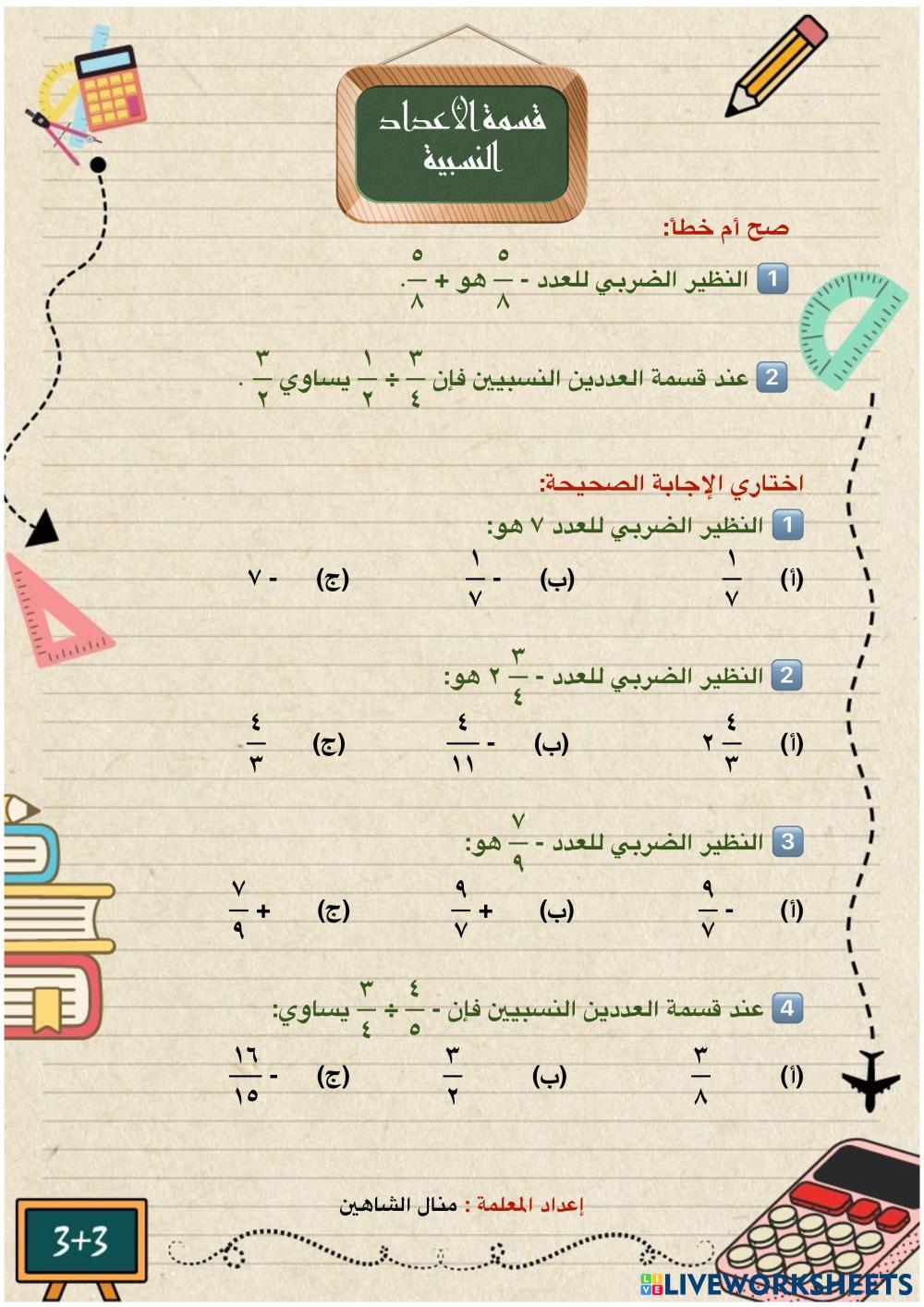 Created by MeMia Math Middle School 7th grade Algebra Arabic Author's Instructions - My Google Classroom Courses × 0 classes selected (0 students total) Quick Access Select all classes (0 classes) All Classes Loading courses... Cancel Share Share to selected Course __COURSE_NAME__ __STUDENT_NAME__ (__STUDENT_EMAIL__) ورقة عمل قسمة الاعداد النسبية Download Worksheet Validation Check my answers Emails my answers to my teacher Full name Group/level School subject Teacher's email or key code Close Submit Validating worksheet... (12) Your answers have been sent to your teacher. Good luck! OK We encountered an error submitting your answers. Please try again. OK Advertisement | Go Ad Free Created by MeMia Math Middle School 7th grade Algebra Arabic Author's Instructions - Explore Worksheets PROPIEDADES DE LA SUMA DE FRACCIONES Math 7th grade PROPIEDADES DE LA SUMA DE FRACCIONES Algebra - Math REALIZAR LA FICHA DE REFUERZO EN BASE A LOS CONOCIMIENTOS ADQUIRIDOS EN CLASE Nabilla Kurnia Math 7th grade Nabilla Kurnia Algebra - Math Bentuk Aljabar LK Identifikasi Bentuk Aljabar Math 7th grade LK Identifikasi Bentuk Aljabar Algebra - Math Diskusikan dengan teman sebangkumu Secuencias numéricas Math 7th grade Secuencias numéricas Algebra - Math Resuelva los ejercicios