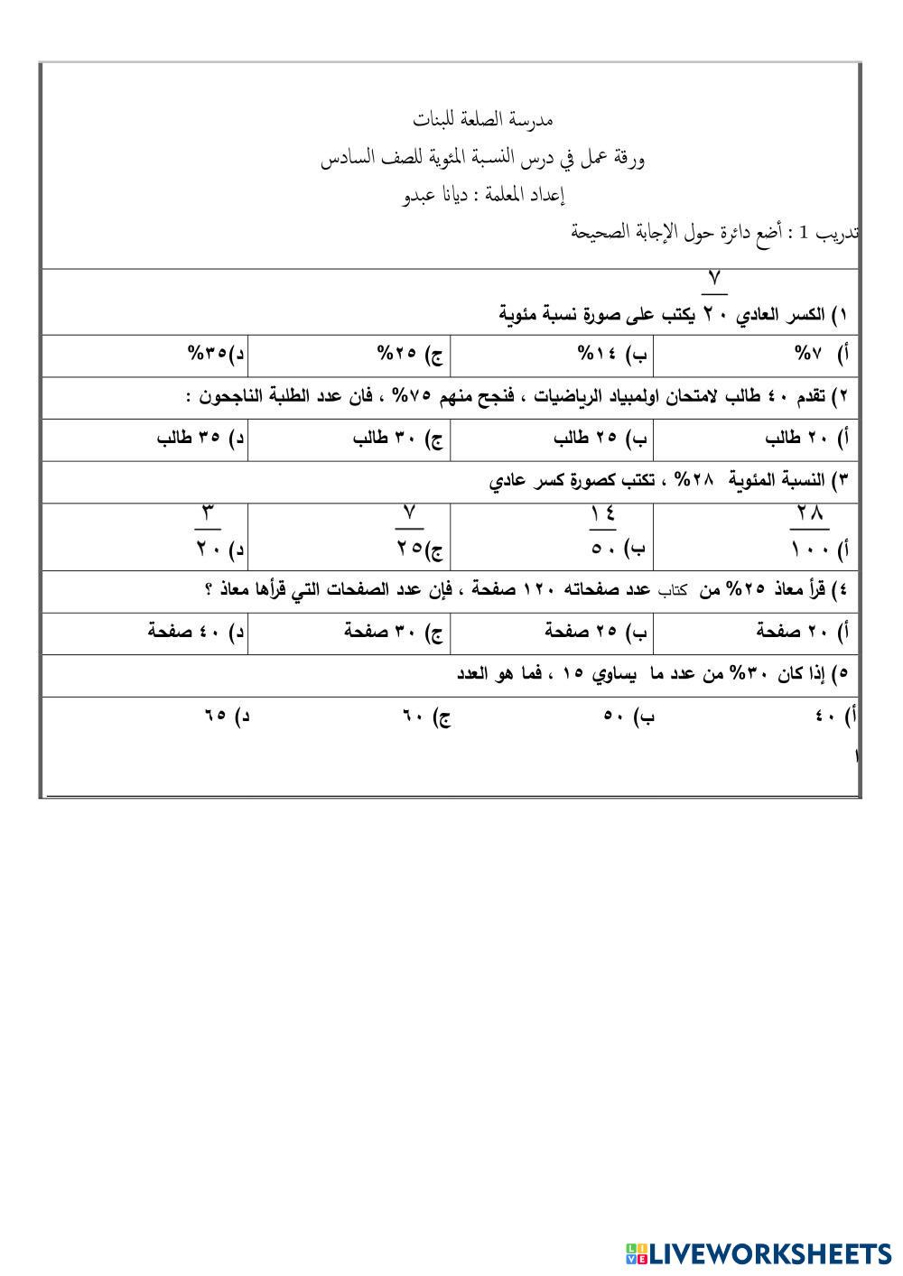 Created by dianaabdo Math Elementary 5th grade Fractions and Decimals Arabic Author's Instructions النسبة المئوية My Google Classroom Courses × 0 classes selected (0 students total) Quick Access Select all classes (0 classes) All Classes Loading courses... Cancel Share Share to selected Course __COURSE_NAME__ __STUDENT_NAME__ (__STUDENT_EMAIL__) النسبة المئوية Download Worksheet Validation Check my answers Emails my answers to my teacher Full name Group/level School subject Teacher's email or key code Close Submit Validating worksheet... (12) Your answers have been sent to your teacher. Good luck! OK We encountered an error submitting your answers. Please try again. OK Advertisement | Go Ad Free Created by dianaabdo Math Elementary 5th grade Fractions and Decimals Arabic Author's Instructions النسبة المئوية Explore Worksheets Процентоор илэрхийлэх Math 5th grade Процентоор илэрхийлэх Fractions and Decimals - Math Процент Діагностувальна робота № 3 "Звичайні дроби" Math 5th grade Діагностувальна робота № 3 "Звичайні дроби" Fractions and Decimals - Math Важливо прочитай кожне завдання перед тим, як почати його роботу. Бажаю успіху та важливої роботи! Поняття про десятковий дріб. Запис десяткових дробів Math 5th grade Поняття про десятковий дріб. Запис десяткових дробів Fractions and Decimals - Math Що таке десятковий дріб і як його записувати. Виконайте завдання. Chìa khóa lịch sử Math 5th grade Chìa khóa lịch sử Fractions and Decimals - Math Em hãy kéo các thẻ vào ô nội dung phù hợp.