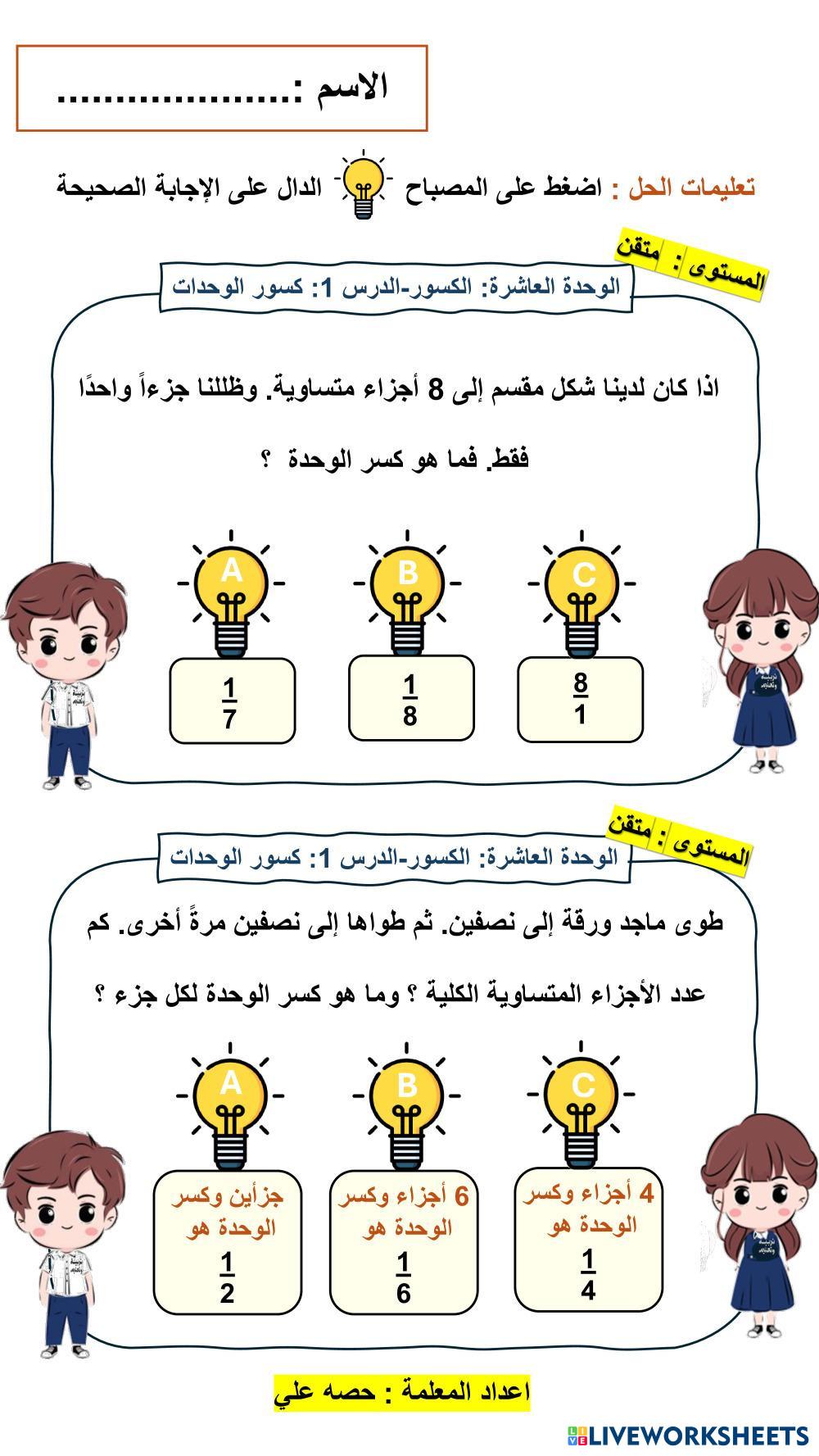 Created by hessa1214 Math Elementary 3rd grade Fractions and Decimals Arabic Author's Instructions اضغط على المصباح الدال على الاجابة الصحيحة My Google Classroom Courses × 0 classes selected (0 students total) Quick Access Select all classes (0 classes) All Classes Loading courses... Cancel Share Share to selected Course __COURSE_NAME__ __STUDENT_NAME__ (__STUDENT_EMAIL__) 10_1 متقن Download Worksheet Validation Check my answers Emails my answers to my teacher Full name Group/level School subject Teacher's email or key code Close Submit Validating worksheet... (12) Your answers have been sent to your teacher. Good luck! OK We encountered an error submitting your answers. Please try again. OK Advertisement | Go Ad Free Created by hessa1214 Math Elementary 3rd grade Fractions and Decimals Arabic Author's Instructions اضغط على المصباح الدال على الاجابة الصحيحة Explore Worksheets Equivalent Fractions Math 3rd grade Equivalent Fractions Fractions and Decimals - Math Use the pictures to answer the questions. كسر الوحدة Math 3rd grade كسر الوحدة Fractions and Decimals - Math اكتب الإجابة كسر الوحدة Math 3rd grade كسر الوحدة Fractions and Decimals - Math أجب على الأسئلة 10_1 فوق الاتقان Math 3rd grade 10_1 فوق الاتقان Fractions and Decimals - Math اضغط على المصباح الدال على الاجابة الصحيحة