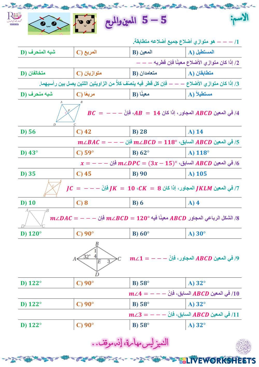 Created byEman Math High School 10th grade Geometry Arabic Author's Instructions المعين والمربع My Google Classroom Courses × 0 classes selected (0 students total) Quick Access Select all classes (0 classes) All Classes Loading courses... Cancel Share Share to selected Course __COURSE_NAME__ __STUDENT_NAME__ (__STUDENT_EMAIL__) المعين والمربع Download Worksheet Validation Check my answers Emails my answers to my teacher Full name Group/level School subject Teacher's email or key code Close Submit Validating worksheet... (12) Your answers have been sent to your teacher. Good luck! OK We encountered an error submitting your answers. Please try again. OK Advertisement | Go Ad Free Created byEman Math High School 10th grade Geometry Arabic Author's Instructions المعين والمربع Explore Worksheets ความชันของเส้นตรง Math 10th grade ความชันของเส้นตรง Geometry - Math ให้นักเรียนเลือกคำตอบที่ถูกต้อง BOT Geometry B Pre-Test Math 10th grade BOT Geometry B Pre-Test Geometry - Math Complete the Pre-test تقييم قياس الزوايا والأقواس2 Math 10th grade تقييم قياس الزوايا والأقواس2 Geometry - Math اجب تقييم قياس الزوايا والأقواس1 Math 10th grade تقييم قياس الزوايا والأقواس1 Geometry - Math أجب
