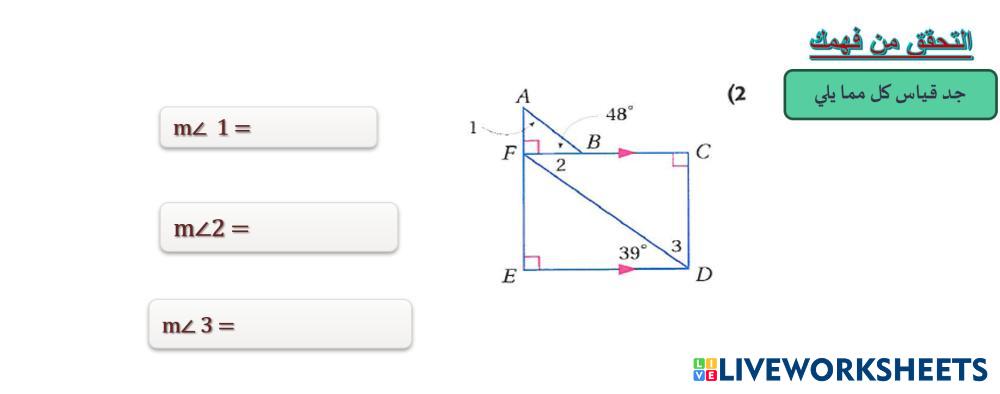 Created by ramihamad1 Math High School 10th grade Geometry Arabic Author's Instructions جد قياس الزوايا My Google Classroom Courses × 0 classes selected (0 students total) Quick Access Select all classes (0 classes) All Classes Loading courses... Cancel Share Share to selected Course __COURSE_NAME__ __STUDENT_NAME__ (__STUDENT_EMAIL__) زوايا المثلث Download Worksheet Validation Check my answers Emails my answers to my teacher Full name Group/level School subject Teacher's email or key code Close Submit Validating worksheet... (12) Your answers have been sent to your teacher. Good luck! OK We encountered an error submitting your answers. Please try again. OK Advertisement | Go Ad Free Created by ramihamad1 Math High School 10th grade Geometry Arabic Author's Instructions جد قياس الزوايا Explore Worksheets LKPD BARISAN GEOMETRI Math 10th grade LKPD BARISAN GEOMETRI Geometry - Math Sebelum mengerjakan mohon dibaca dengan secara seksama pentunjuk yang ada di dalam LKPD. الزوايا Math 10th grade الزوايا Geometry - Math ايجاد الزوايا المجهولة Triangle congruence Math 10th grade Triangle congruence Geometry - Math Complete it تصنيف المثلثات Math 10th grade تصنيف المثلثات Geometry - Math حدد الاجابة الصحيحة لكل مما يلي