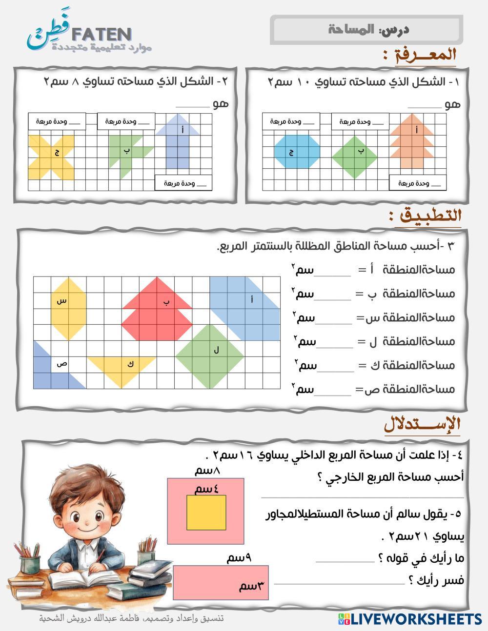 Created byفاطمة عبدالله درويش الشحي Math Elementary 4th grade Measurement Arabic Author's Instructions حساب المساحة My Google Classroom Courses × 0 classes selected (0 students total) Quick Access Select all classes (0 classes) All Classes Loading courses... Cancel Share Share to selected Course __COURSE_NAME__ __STUDENT_NAME__ (__STUDENT_EMAIL__) المساحة Download Worksheet Validation Check my answers Emails my answers to my teacher Full name Group/level School subject Teacher's email or key code Close Submit Validating worksheet... (12) Your answers have been sent to your teacher. Good luck! OK We encountered an error submitting your answers. Please try again. OK Advertisement | Go Ad Free Created byفاطمة عبدالله درويش الشحي Math Elementary 4th grade Measurement Arabic Author's Instructions حساب المساحة Explore Worksheets Stambinimas ir smulkinimas Math 4th grade Stambinimas ir smulkinimas Measurement - Math Sustambink ir susmulkink UNIDADES DE MEDIDA Math 4th grade UNIDADES DE MEDIDA Measurement - Math REPASO Verifica equivalenze Math 4th grade Verifica equivalenze Measurement - Math Completa inserendo i numeri nelle tabelle e poi esegui le equivalenze MEDIDAS Y UNIDADES Math 4th grade MEDIDAS Y UNIDADES Measurement - Math Objetivo: Identificar, comparar y aplicar unidades de medida de longitud, masa y capacidad en situaciones cotidianas.