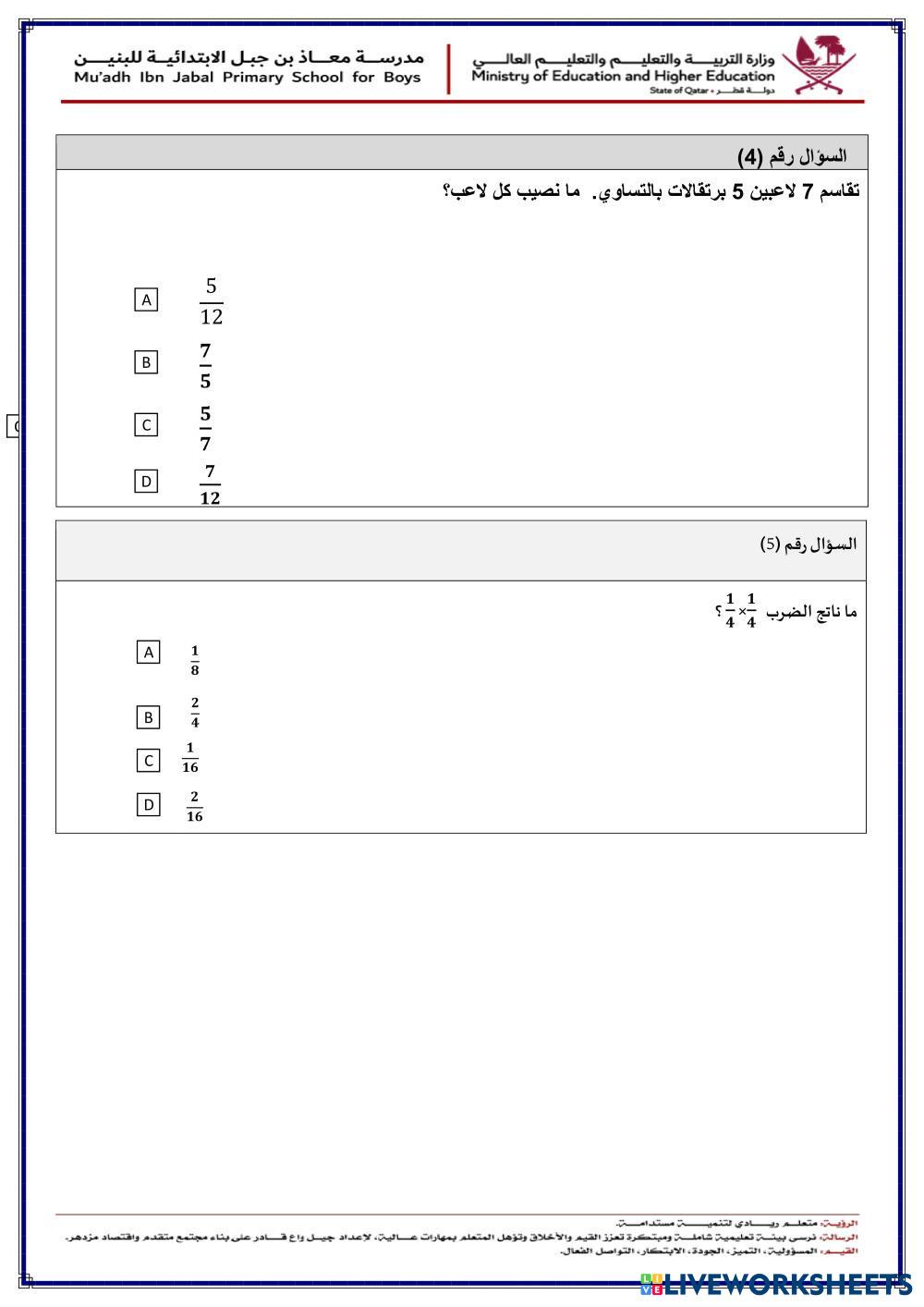 Created by abidi1978 Math Elementary 5th grade Multiplication and Division Arabic Author's Instructions My Google Classroom Courses × 0 classes selected (0 students total) Quick Access Select all classes (0 classes) All Classes Loading courses... Cancel Share Share to selected Course __COURSE_NAME__ __STUDENT_NAME__ (__STUDENT_EMAIL__) مسابقة الابطال Download Worksheet Validation Check my answers Emails my answers to my teacher Full name Group/level School subject Teacher's email or key code Close Submit Validating worksheet... (12) Your answers have been sent to your teacher. Good luck! OK We encountered an error submitting your answers. Please try again. OK Advertisement | Go Ad Free Created by abidi1978 Math Elementary 5th grade Multiplication and Division Arabic Author's Instructions Explore Worksheets فهم التعابير Math 5th grade فهم التعابير Multiplication and Division - Math حلي ورقة العمل Ôn tập Math 5th grade Ôn tập Multiplication and Division - Math Đọc kĩ nội dung bài tập Ôn tập Math 5th grade Ôn tập Multiplication and Division - Math Đọc kĩ nội dung bài tập الحل بترتيب عكسي Math 5th grade الحل بترتيب عكسي Multiplication and Division - Math قم بحل هذا السؤال بالخطوات العكسية