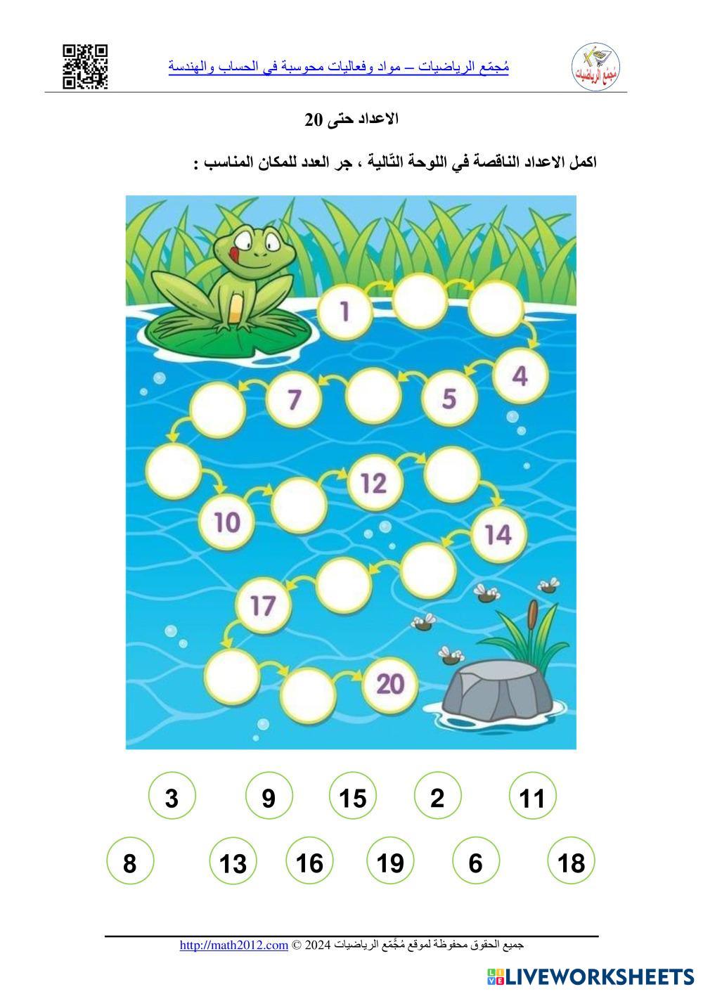 فعالية محوسبة في الاعداد حتى 20 ، اكمل الاعداد الناقصة بحسب ترتيبها في اللوحة الملونة