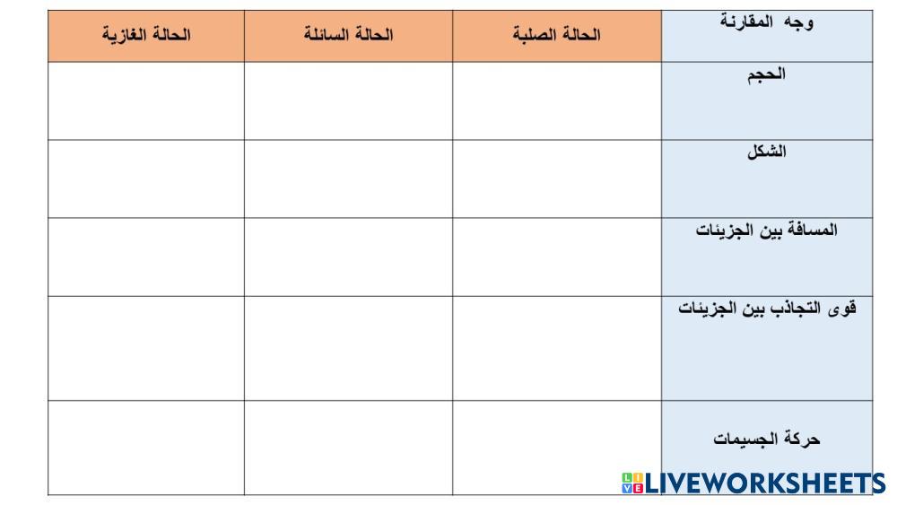 اختاري الاجابة الصحيحة لكل فرع في الجدول بحيث تكون مناسبة لحالة المادة المحددة