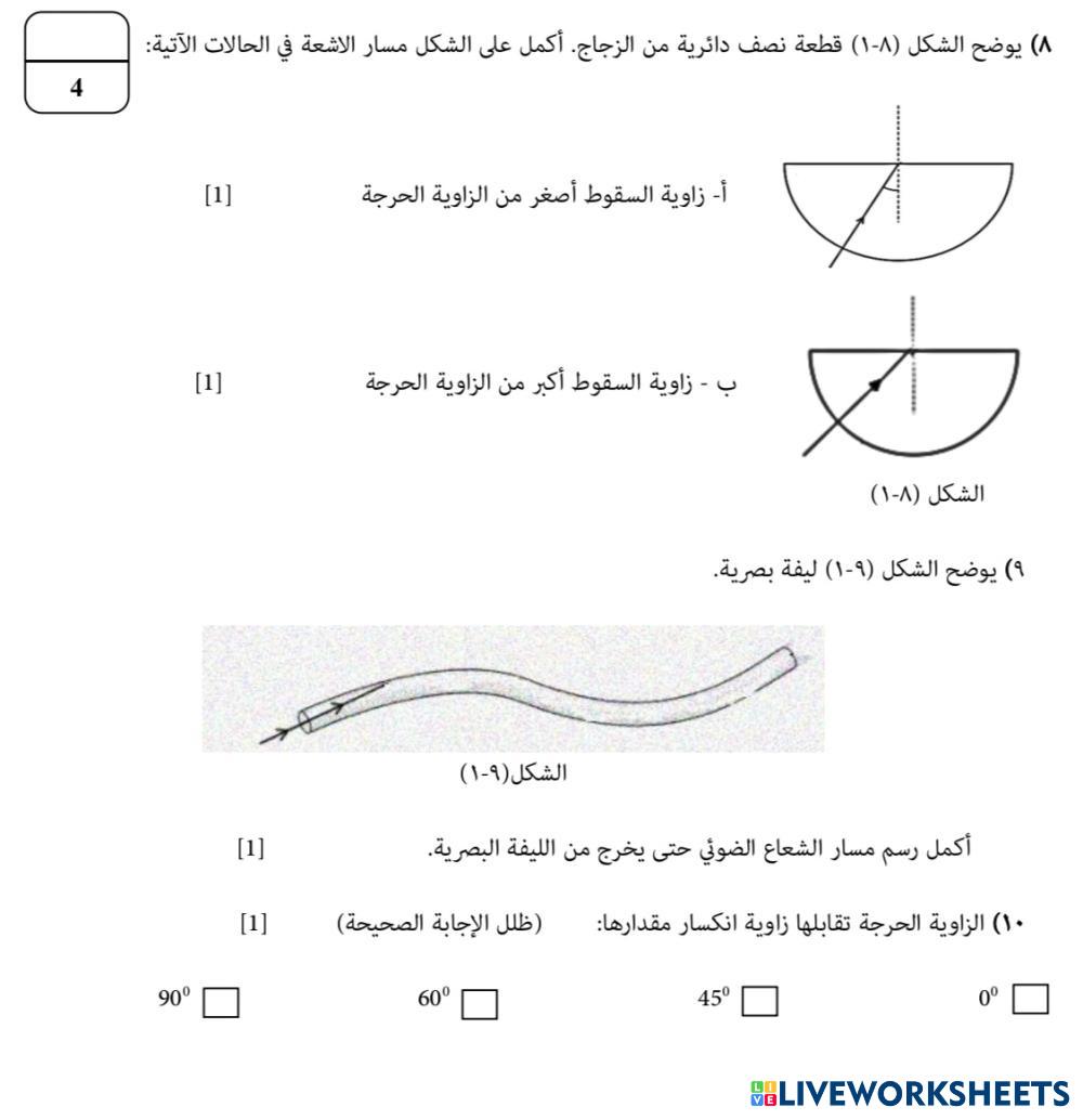 اسئلة اختبارات سابقة على درس الانعكاس الداخلي الكلي