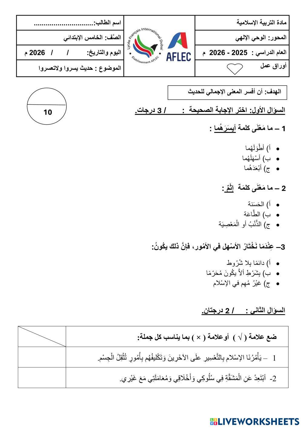 Created bySomaiaSabryAhmed Social Studies Elementary 5th grade History Arabic Author's Instructions رجاء حل ورقة العمل My Google Classroom Courses × 0 classes selected (0 students total) Quick Access Select all classes (0 classes) All Classes Loading courses... Cancel Share Share to selected Course __COURSE_NAME__ __STUDENT_NAME__ (__STUDENT_EMAIL__) ورقة عمل حديث يسروا ولا تعسروا Download Worksheet Validation Check my answers Emails my answers to my teacher Full name Group/level School subject Teacher's email or key code Close Submit Validating worksheet... (12) Your answers have been sent to your teacher. Good luck! OK We encountered an error submitting your answers. Please try again. OK Advertisement | Go Ad Free Created bySomaiaSabryAhmed Social Studies Elementary 5th grade History Arabic Author's Instructions رجاء حل ورقة العمل Explore Worksheets Easter Quiz - Past Parliament - Global Events Social Studies 5th grade Easter Quiz - Past Parliament - Global Events History - Social Studies Read each question carefully, choose the correct answer فهم المقروء Social Studies 5th grade فهم المقروء History - Social Studies القراءة والاجابة على الاسئلة CURIOSIDADES DE LA EDAD MODERNA Social Studies 5th grade CURIOSIDADES DE LA EDAD MODERNA History - Social Studies COMPRENSIÓN LECTORA Greek city grade 5 Social Studies 5th grade Greek city grade 5 History - Social Studies complete the questions