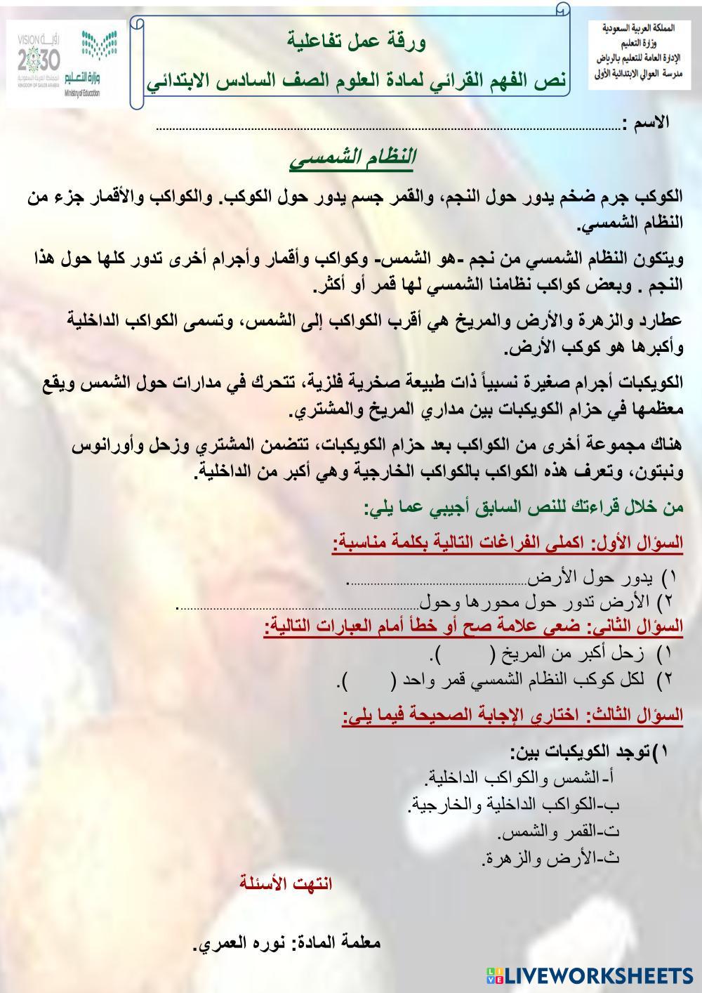 Created byNor-AlAm The Solar System The Solar System Age 4-10 level: 1 Arabic Author's Instructions النظام الشمسي My Google Classroom Courses × 0 classes selected (0 students total) Quick Access Select all classes (0 classes) All Classes Loading courses... Cancel Share Share to selected Course __COURSE_NAME__ __STUDENT_NAME__ (__STUDENT_EMAIL__) Solar system Download Worksheet Validation Check my answers Emails my answers to my teacher Full name Group/level School subject Teacher's email or key code Close Submit Validating worksheet... (12) Your answers have been sent to your teacher. Good luck! OK We encountered an error submitting your answers. Please try again. OK Advertisement | Go Ad Free Created byNor-AlAm The Solar System The Solar System Age 4-10 level: 1 Arabic Author's Instructions النظام الشمسي