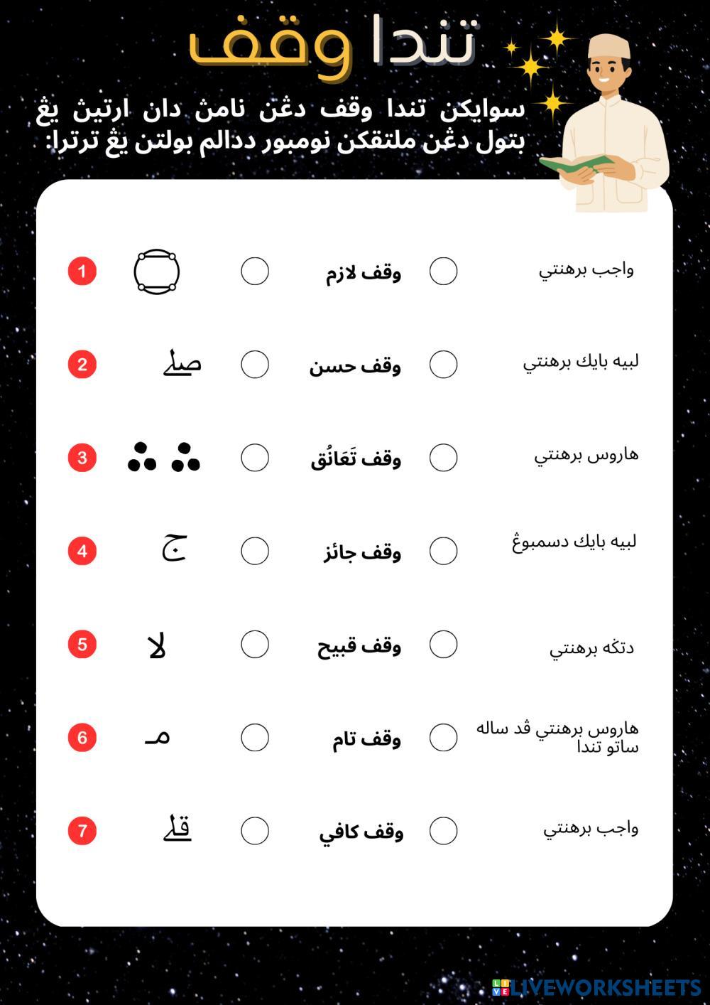 Created byMunawwarah Tajwid Tajwid Age 14+ level: Year 9 , 10 and 11 Arabic Author's Instructions Tanda Waqaf dalam Al-Quran My Google Classroom Courses × 0 classes selected (0 students total) Quick Access Select all classes (0 classes) All Classes Loading courses... Cancel Share Share to selected Course __COURSE_NAME__ __STUDENT_NAME__ (__STUDENT_EMAIL__) Tanda Waqaf Download Worksheet Validation Check my answers Emails my answers to my teacher Full name Group/level School subject Teacher's email or key code Close Submit Validating worksheet... (12) Your answers have been sent to your teacher. Good luck! OK We encountered an error submitting your answers. Please try again. OK Advertisement | Go Ad Free Created byMunawwarah Tajwid Tajwid Age 14+ level: Year 9 , 10 and 11 Arabic Author's Instructions Tanda Waqaf dalam Al-Quran