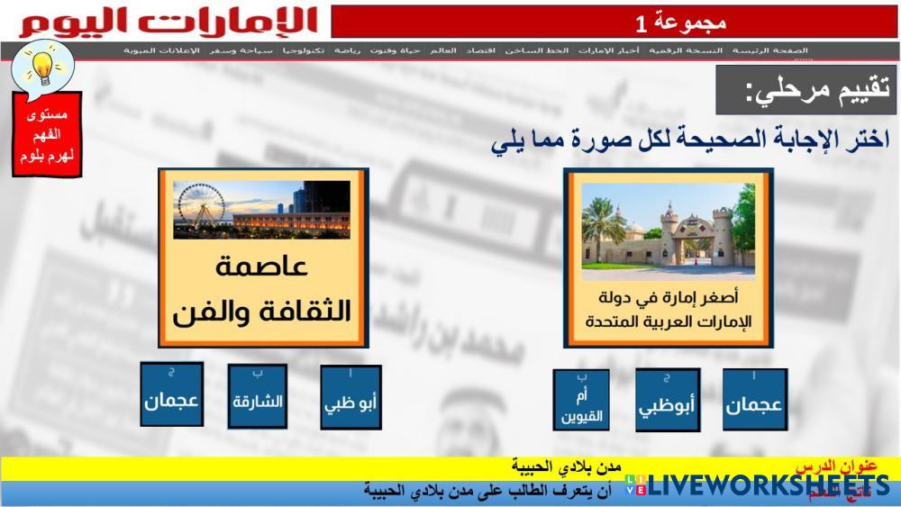 Created byfatma mohammed UAE UAE Age 7 level: 1 Arabic Author's Instructions My Google Classroom Courses × 0 classes selected (0 students total) Quick Access Select all classes (0 classes) All Classes Loading courses... Cancel Share Share to selected Course __COURSE_NAME__ __STUDENT_NAME__ (__STUDENT_EMAIL__) UAE3 Download Worksheet Validation Check my answers Emails my answers to my teacher Full name Group/level School subject Teacher's email or key code Close Submit Validating worksheet... (12) Your answers have been sent to your teacher. Good luck! OK We encountered an error submitting your answers. Please try again. OK Advertisement | Go Ad Free Created byfatma mohammed UAE UAE Age 7 level: 1 Arabic Author's Instructions