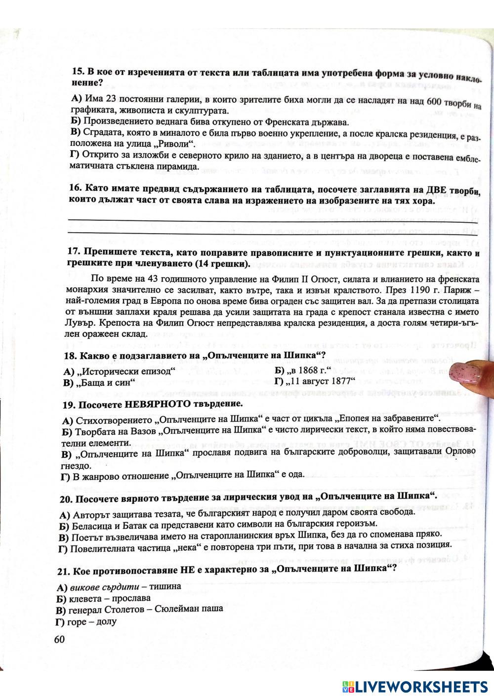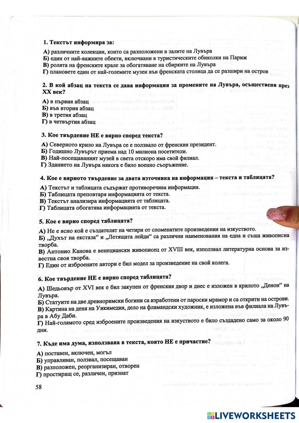Created by simmi0101 English Language Middle School 7th grade Reading and Text Analysis Bulgarian Author's Instructions bg My Google Classroom Courses × 0 classes selected (0 students total) Quick Access Select all classes (0 classes) All Classes Loading courses... Cancel Share Share to selected Course __COURSE_NAME__ __STUDENT_NAME__ (__STUDENT_EMAIL__) Тест Download Worksheet Validation Check my answers Emails my answers to my teacher Full name Group/level School subject Teacher's email or key code Close Submit Validating worksheet... (12) Your answers have been sent to your teacher. Good luck! OK We encountered an error submitting your answers. Please try again. OK Advertisement | Go Ad Free Created by simmi0101 English Language Middle School 7th grade Reading and Text Analysis Bulgarian Author's Instructions bg Explore Worksheets city life English Language 7th grade city life Reading and Text Analysis - English Language Read the text and answer questions about city life قيمة العلم English Language 7th grade قيمة العلم Reading and Text Analysis - English Language أجب عن ورقة العمل Teamwork - Reading 1 - page 64 English Language 7th grade Teamwork - Reading 1 - page 64 Reading and Text Analysis - English Language Read Ella's blog and answer the following questions. Identifica los tipos de texto English Language 7th grade Identifica los tipos de texto Reading and Text Analysis - English Language Lee cada texto e identifica la tipología a la que pertenece.