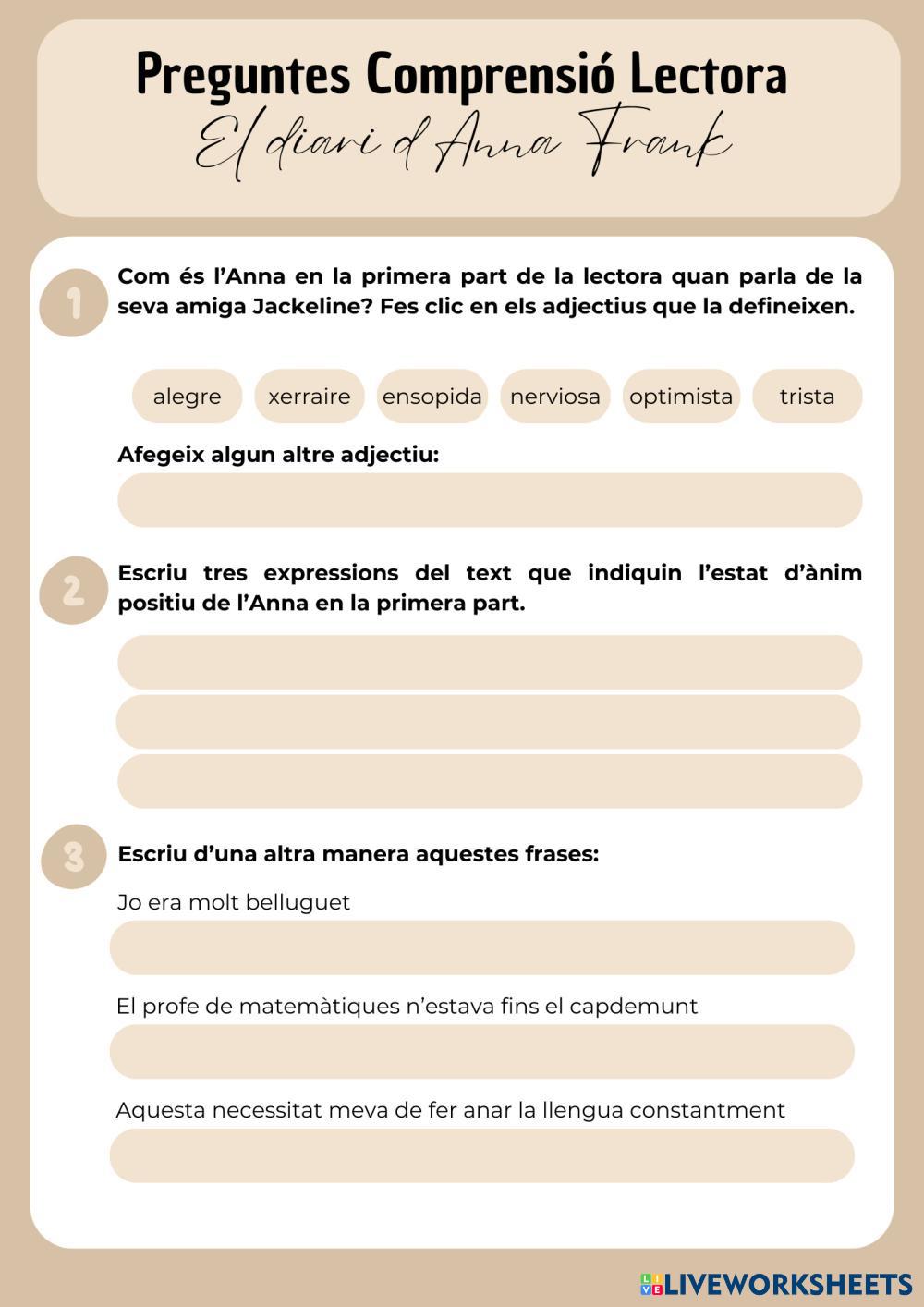 Created by laiabrui Català Reading Comprehension Age 9 level: 5th Catalan Author's Instructions Comprensió Lectora Anna Frank My Google Classroom Courses × 0 classes selected (0 students total) Quick Access Select all classes (0 classes) All Classes Loading courses... Cancel Share Share to selected Course __COURSE_NAME__ __STUDENT_NAME__ (__STUDENT_EMAIL__) Comprensió lectora Anna Frank Download Worksheet Validation Check my answers Emails my answers to my teacher Full name Group/level School subject Teacher's email or key code Close Submit Validating worksheet... (12) Your answers have been sent to your teacher. Good luck! OK We encountered an error submitting your answers. Please try again. OK Advertisement | Go Ad Free Created by laiabrui Català Reading Comprehension Age 9 level: 5th Catalan Author's Instructions Comprensió Lectora Anna Frank