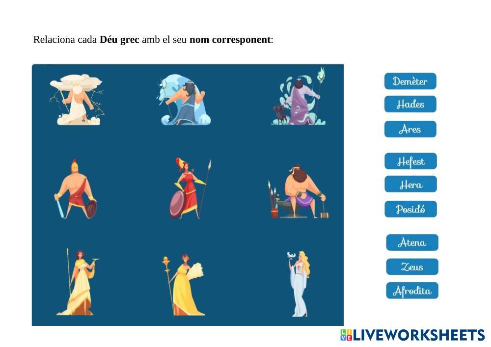 Relaciona la imatge de cada Déu grec amb el seu nom.
