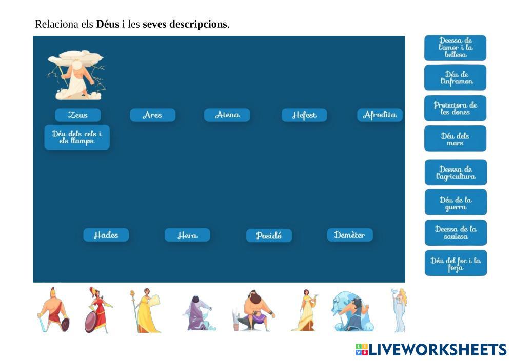 Relaciona cada imatge amb el nom del Déu. També relaciona què feia cadascun dels Déus grecs.