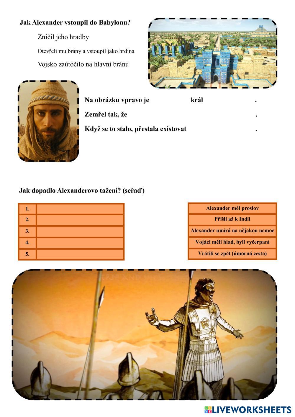 Created byVašek Koplík Dějepis Alexander Veliký Age 5-17 level: 6 Czech Author's Instructions My Google Classroom Courses × 0 classes selected (0 students total) Quick Access Select all classes (0 classes) All Classes Loading courses... Cancel Share Share to selected Course __COURSE_NAME__ __STUDENT_NAME__ (__STUDENT_EMAIL__) Alexander Veliký Download Worksheet Validation Check my answers Emails my answers to my teacher Full name Group/level School subject Teacher's email or key code Close Submit Validating worksheet... (12) Your answers have been sent to your teacher. Good luck! OK We encountered an error submitting your answers. Please try again. OK Advertisement | Go Ad Free Created byVašek Koplík Dějepis Alexander Veliký Age 5-17 level: 6 Czech Author's Instructions