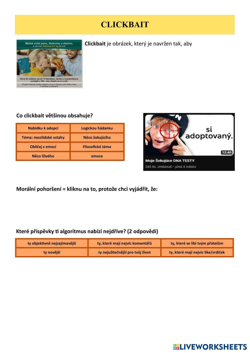 Created byVašek Koplík Informatika Informatika Age 12-18 level: 7 Czech Author's Instructions My Google Classroom Courses × 0 classes selected (0 students total) Quick Access Select all classes (0 classes) All Classes Loading courses... Cancel Share Share to selected Course __COURSE_NAME__ __STUDENT_NAME__ (__STUDENT_EMAIL__) Clickbait Download Worksheet Validation Check my answers Emails my answers to my teacher Full name Group/level School subject Teacher's email or key code Close Submit Validating worksheet... (12) Your answers have been sent to your teacher. Good luck! OK We encountered an error submitting your answers. Please try again. OK Advertisement | Go Ad Free Created byVašek Koplík Informatika Informatika Age 12-18 level: 7 Czech Author's Instructions
