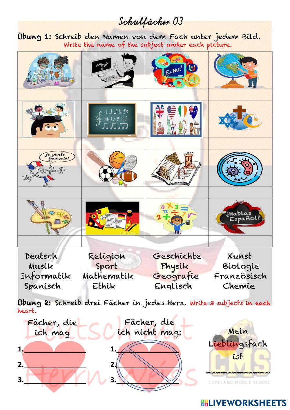 Activities to practice school subjects vocabulary and the present perfect tense.