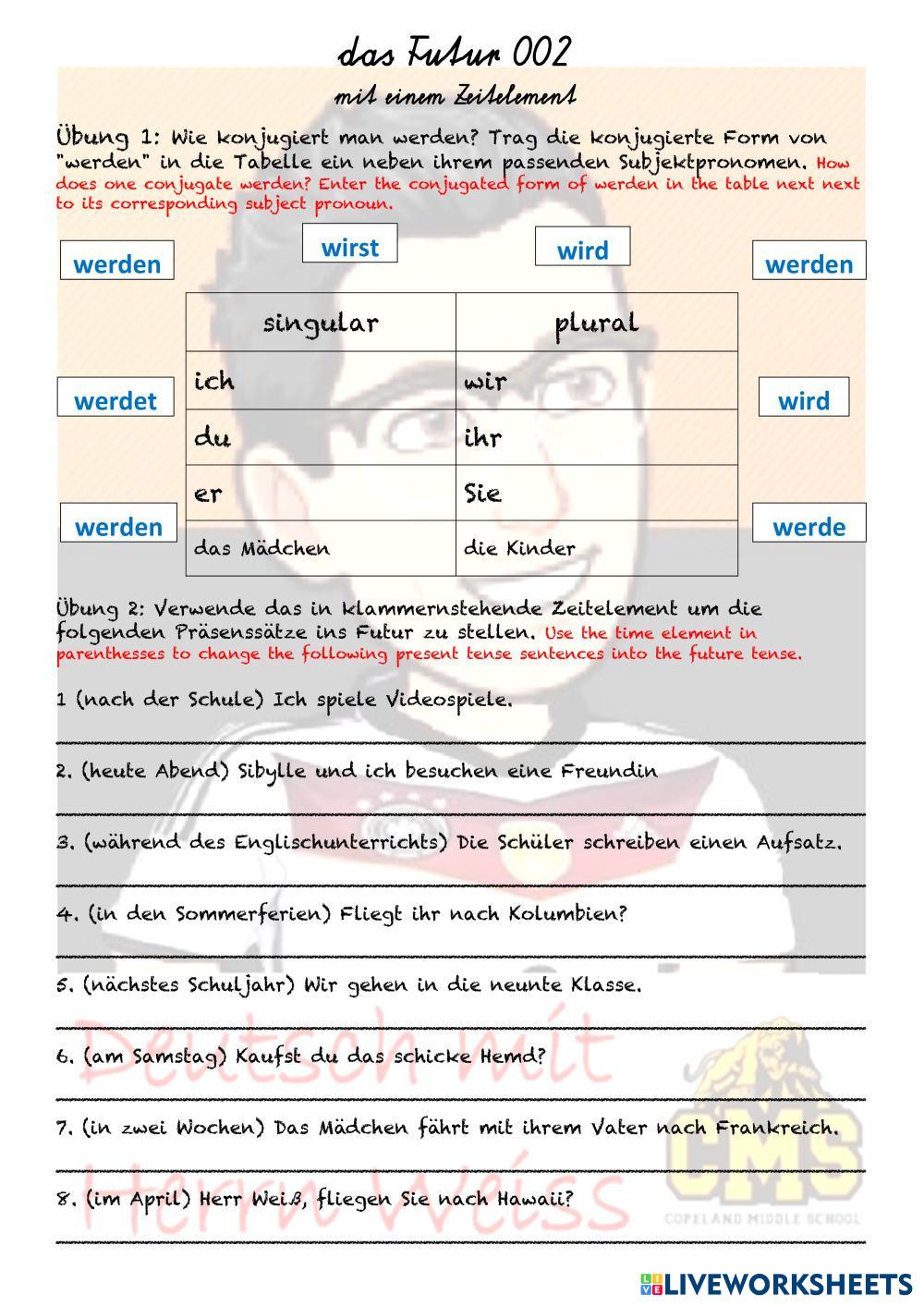 Exercises to practice the future tense using a time element, as well as conjugation of werden to prepare for future tense with werden + infintive.