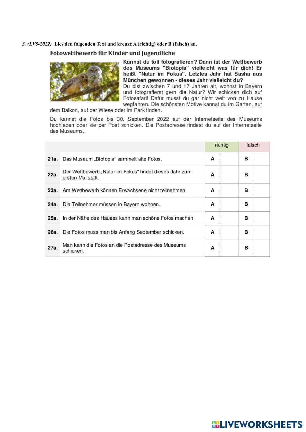 Created bysofia karataki Deutsch als Fremdsprache (DaF) LV Stadt Land Age 10+ level: A1-A2 German Author's Instructions My Google Classroom Courses × 0 classes selected (0 students total) Quick Access Select all classes (0 classes) All Classes Loading courses... Cancel Share Share to selected Course __COURSE_NAME__ __STUDENT_NAME__ (__STUDENT_EMAIL__) KPG- Stadt-Land - Aufgabe 3 - 5 Download Worksheet Validation Check my answers Emails my answers to my teacher Full name Group/level School subject Teacher's email or key code Close Submit Validating worksheet... (12) Your answers have been sent to your teacher. Good luck! OK We encountered an error submitting your answers. Please try again. OK Advertisement | Go Ad Free Created bysofia karataki Deutsch als Fremdsprache (DaF) LV Stadt Land Age 10+ level: A1-A2 German Author's Instructions