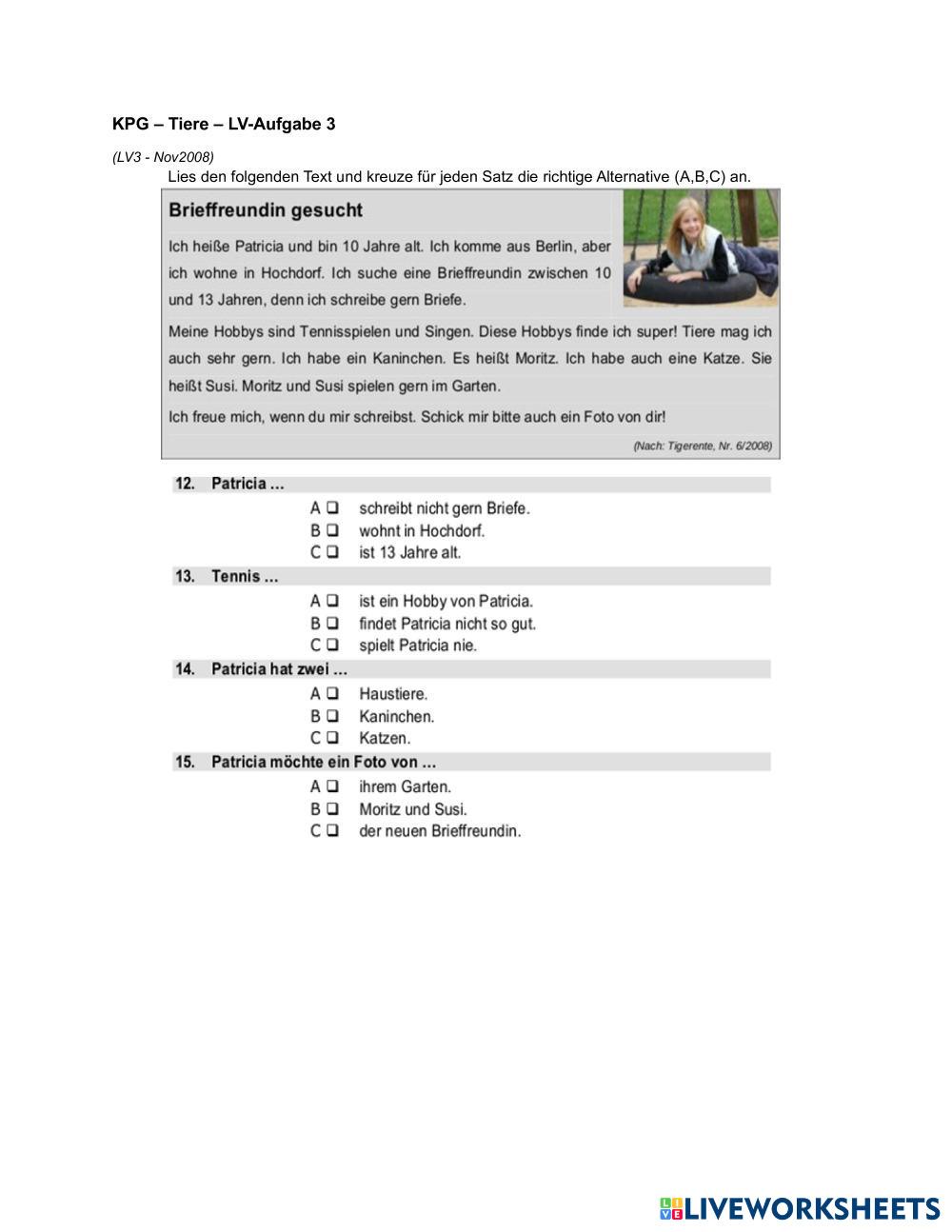Created bysofia karataki Deutsch als Fremdsprache (DaF) LV Tiere Age 10+ level: A1-A2 German Author's Instructions My Google Classroom Courses × 0 classes selected (0 students total) Quick Access Select all classes (0 classes) All Classes Loading courses... Cancel Share Share to selected Course __COURSE_NAME__ __STUDENT_NAME__ (__STUDENT_EMAIL__) KPG - Tiere - LV-Aufgabe 3 Download Worksheet Validation Check my answers Emails my answers to my teacher Full name Group/level School subject Teacher's email or key code Close Submit Validating worksheet... (12) Your answers have been sent to your teacher. Good luck! OK We encountered an error submitting your answers. Please try again. OK Advertisement | Go Ad Free Created bysofia karataki Deutsch als Fremdsprache (DaF) LV Tiere Age 10+ level: A1-A2 German Author's Instructions