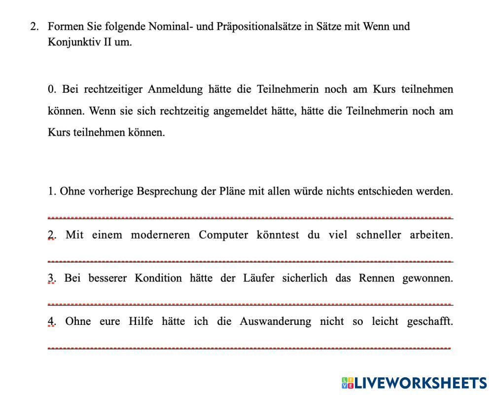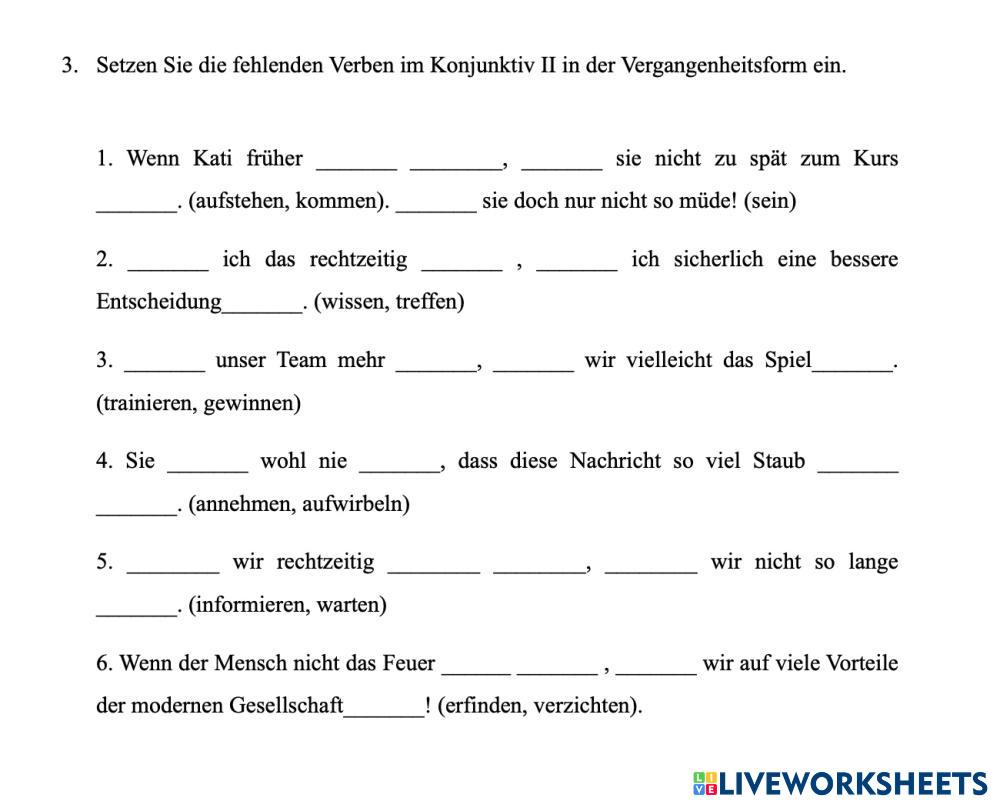 Created by vertesaljaizs ESL German B1 Grammar German Author's Instructions Löse die AUfgaben My Google Classroom Courses × 0 classes selected (0 students total) Quick Access Select all classes (0 classes) All Classes Loading courses... Cancel Share Share to selected Course __COURSE_NAME__ __STUDENT_NAME__ (__STUDENT_EMAIL__) Konjuktiv II Download Worksheet Validation Check my answers Emails my answers to my teacher Full name Group/level School subject Teacher's email or key code Close Submit Validating worksheet... (12) Your answers have been sent to your teacher. Good luck! OK We encountered an error submitting your answers. Please try again. OK Advertisement | Go Ad Free Created by vertesaljaizs ESL German B1 Grammar German Author's Instructions Löse die AUfgaben Explore Worksheets Prüfung B1.4 Momente Lektionen 15 & 16 ESL B1 Prüfung B1.4 Momente Lektionen 15 & 16 Grammar - ESL Ergänzen Sie. Zu Infinitiv ESL B1 Zu Infinitiv Grammar - ESL Zu-Infinitiv Prüfung B1 ESL B1 Prüfung B1 Grammar - ESL Viel Erfolg! Kundenservicegespräch ESL B1 Kundenservicegespräch Grammar - ESL Kundenservicegespräch