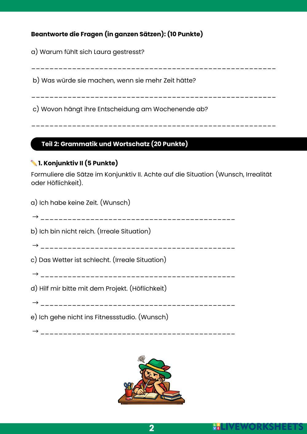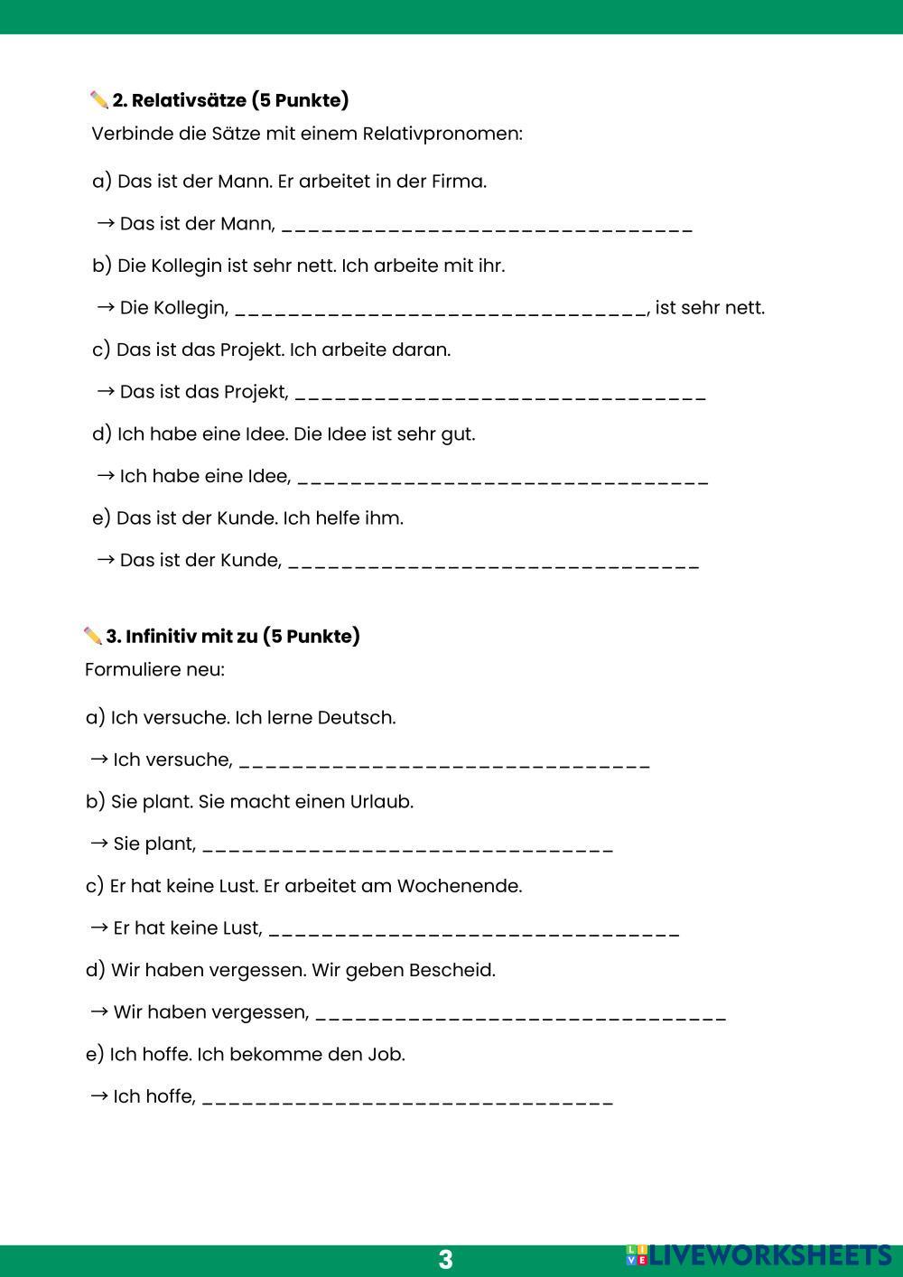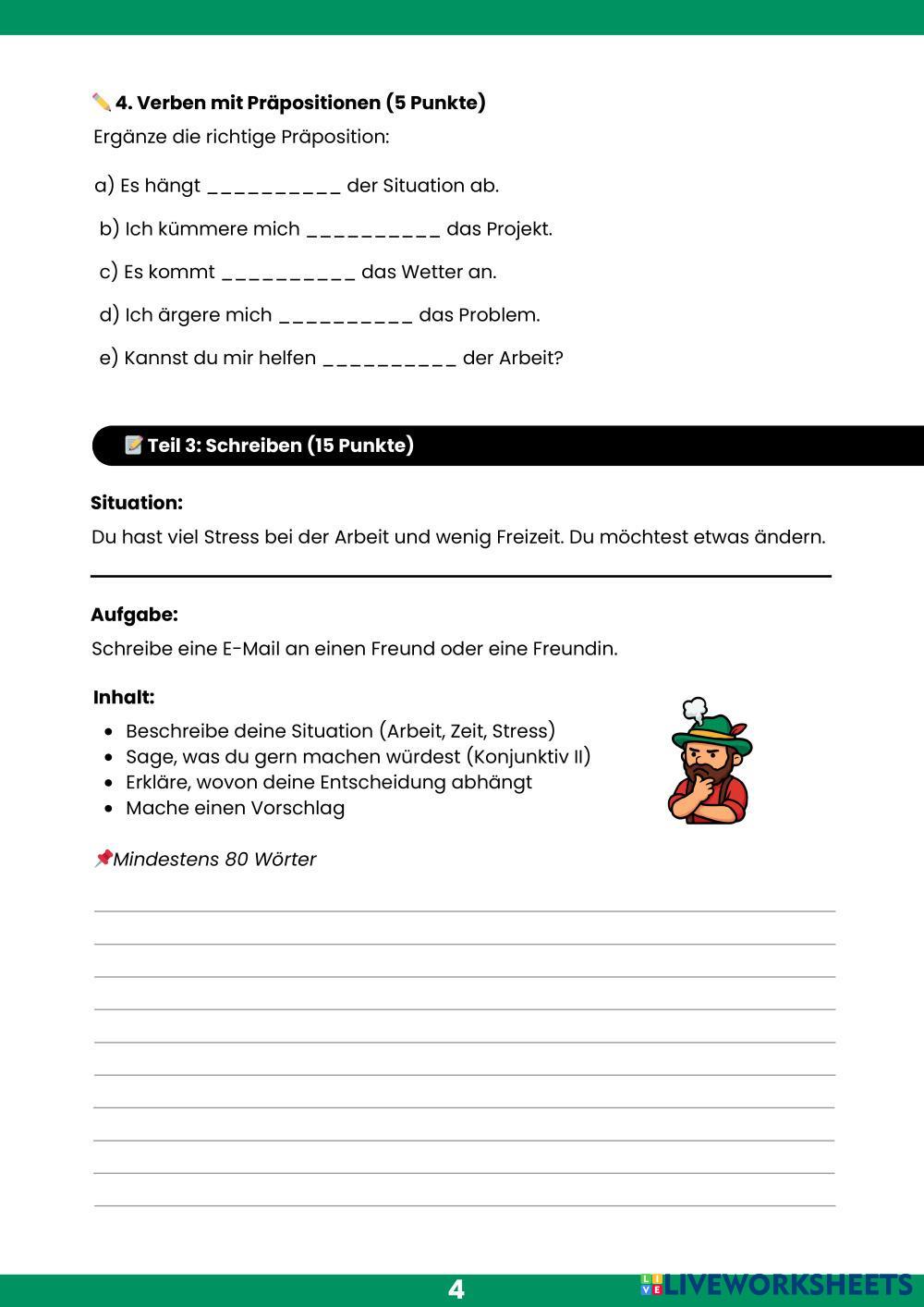 Created byFabricio Espinoza ESL German B1 Grammar German Author's Instructions Viel Erfolg! My Google Classroom Courses × 0 classes selected (0 students total) Quick Access Select all classes (0 classes) All Classes Loading courses... Cancel Share Share to selected Course __COURSE_NAME__ __STUDENT_NAME__ (__STUDENT_EMAIL__) Prüfung B1 Download Worksheet Validation Check my answers Emails my answers to my teacher Full name Group/level School subject Teacher's email or key code Close Submit Validating worksheet... (12) Your answers have been sent to your teacher. Good luck! OK We encountered an error submitting your answers. Please try again. OK Advertisement | Go Ad Free Created byFabricio Espinoza ESL German B1 Grammar German Author's Instructions Viel Erfolg! Explore Worksheets Prüfung B1.4 Momente Lektionen 15 & 16 ESL B1 Prüfung B1.4 Momente Lektionen 15 & 16 Grammar - ESL Ergänzen Sie. Zu Infinitiv ESL B1 Zu Infinitiv Grammar - ESL Zu-Infinitiv Kundenservicegespräch ESL B1 Kundenservicegespräch Grammar - ESL Kundenservicegespräch Konjuktiv II ESL B1 Konjuktiv II Grammar - ESL Löse die AUfgaben